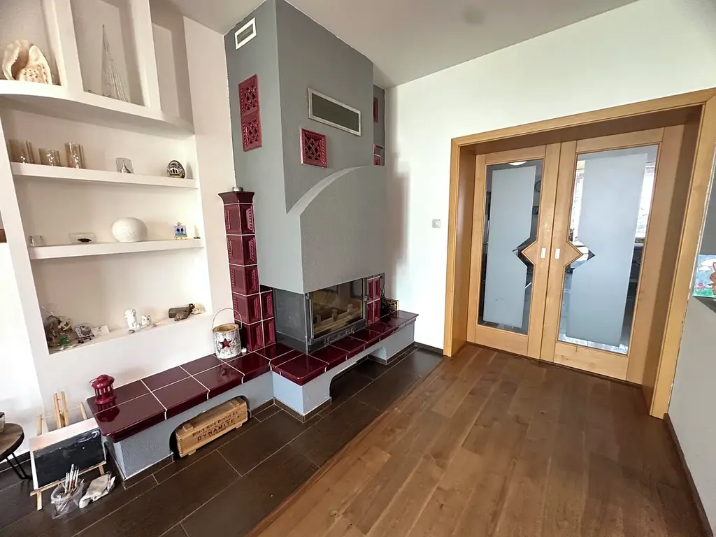 • Obývací pokoj s dřevěnou podlahou, krbem a vstupem na prosklenou krytou pergolu