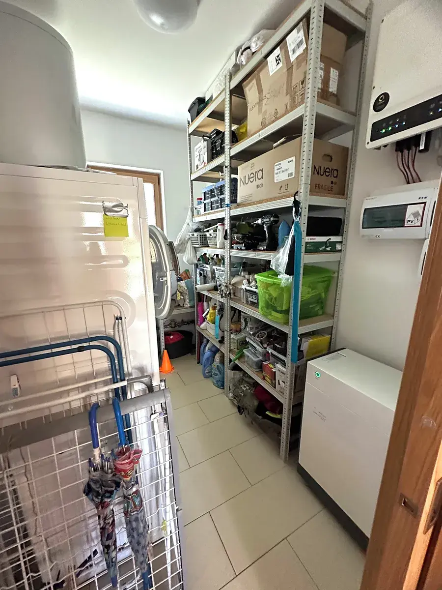 • Technická místnost s pračkou, sušičkou, centrálním vysavačem Husky (2024), bojlerem, jističovou skříní, úložnými regály a zařízením k fotovoltaice