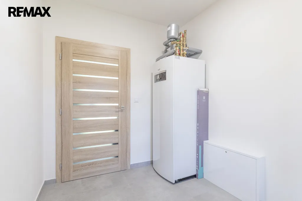 Dům je dispozičně velmi dobře navržen pro menší rodinu. U vstupu je zádveří, kde se nachází jednotka tepelného čerpadla, kterou lze prakticky a esteticky zakomponovat do předsíňové stěny. Dále je zde WC. Následuje prostorný obývací pokoj s kuchyní, přes který se dostanete na jižně orientovanou terasu, kde je možné nechat vyrobit pergolu na míru. V ceně je zahrnuta kuchyňská linka českého výrobce včetně elektrospotřebičů značky Philco – indukční deska, digestoř, kombinovaná lednice s mrazákem, dřez s baterií, myčka, mikrovlnná trouba.