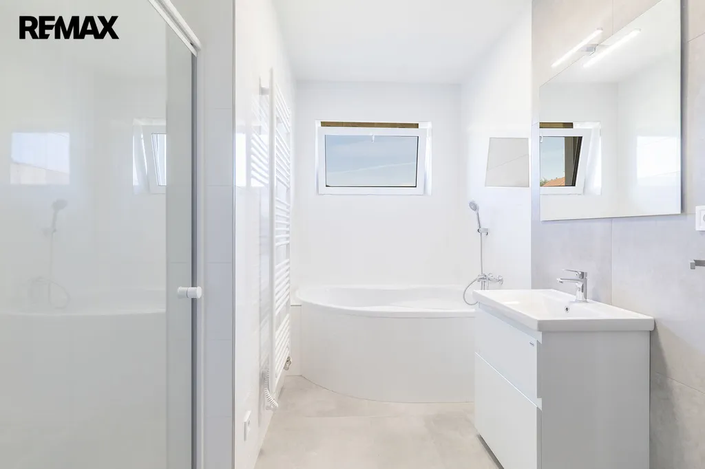 V klidové části domu nalezneme tři pokoje, koupelnu s vanou, sprchovým koutem.