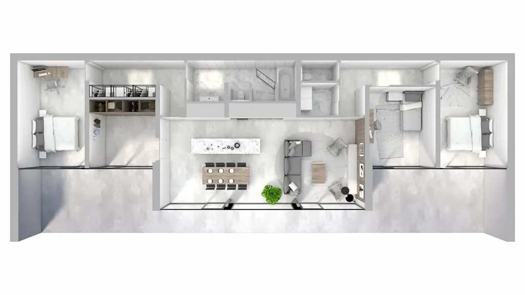 Dispozice domu je dále rozdělena do dvou klidových zón situovaných v částečně zapuštěné části vily. První chodba vede ke společné koupelně a hlavní ložnici s moderní průchozí šatnou. Druhá část domu nabízí dva dětské pokoje, samostatnou toaletu a praktickou prádelnu. Z této části je zároveň přístup do soukromého atria a rozlehlé zahrady, která poskytuje ideální prostor pro vytvoření relaxační zóny s bazénem, saunou či pergolou – vše s důrazem na naprosté soukromí.