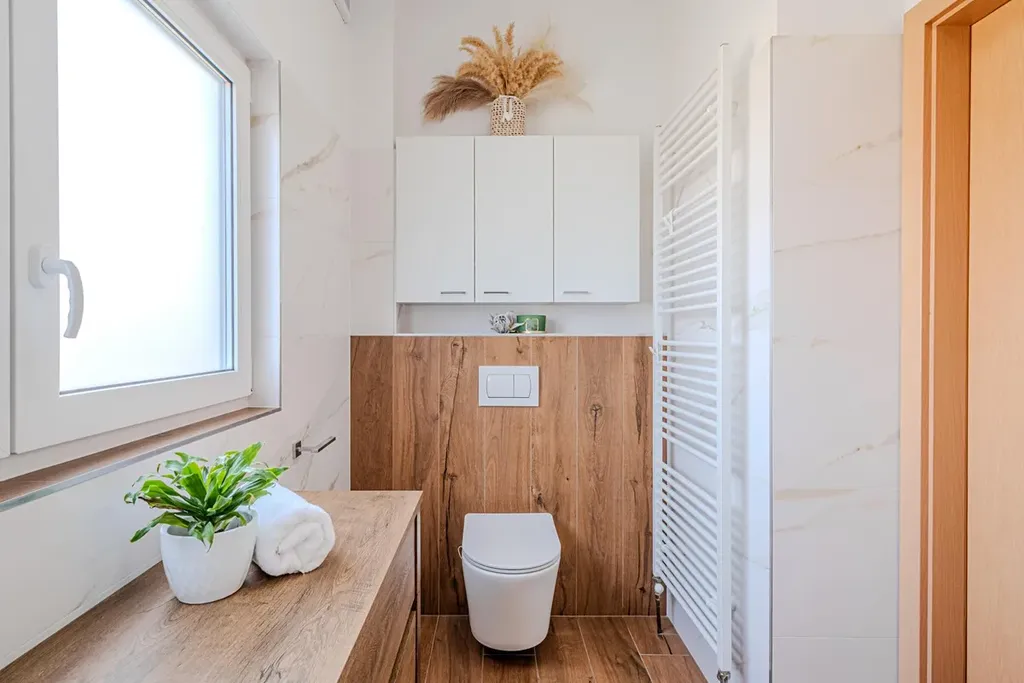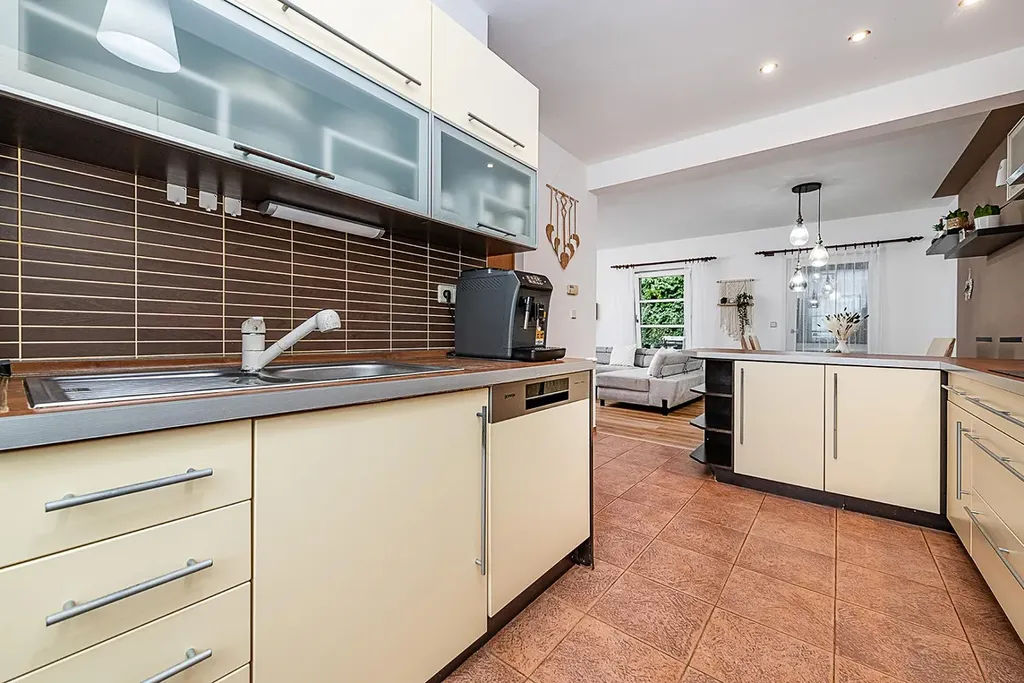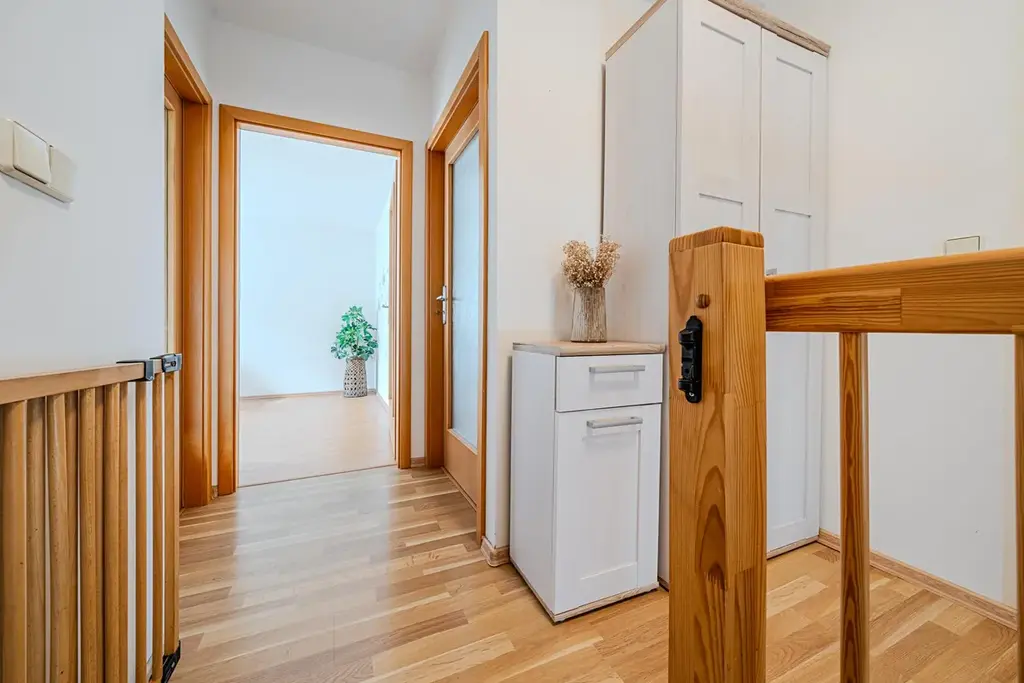 Dispozice domu je praktická a pohodlná pro každodenní rodinný život. V přízemí se nachází obývací pokoj s krbovými kamny, která dodávají interiéru útulnou atmosféru, dále kuchyň s jídelnou a koupelna se sprchovým koutem a toaletou. V patře jsou tři samostatné pokoje a druhá koupelna s vanou. Dostatek úložného prostoru zajišťují vestavěné skříně i prostor pod schody.