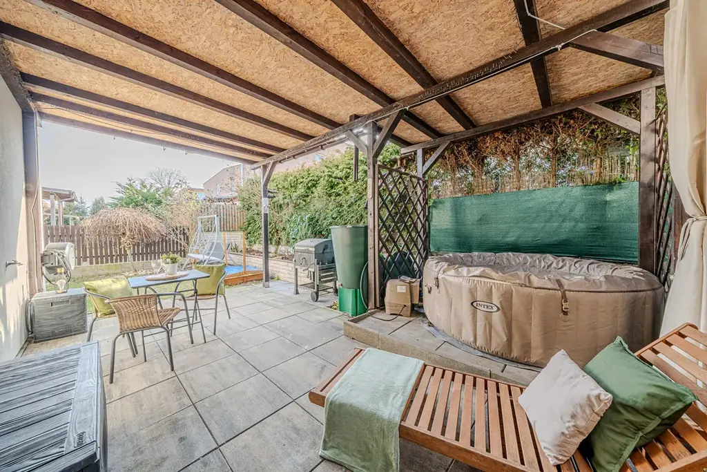Zahrada s pergolou nabízí příjemné soukromí pro relaxaci i posezení s rodinou či přáteli, před domem jsou k dispozici dvě parkovací místa.
