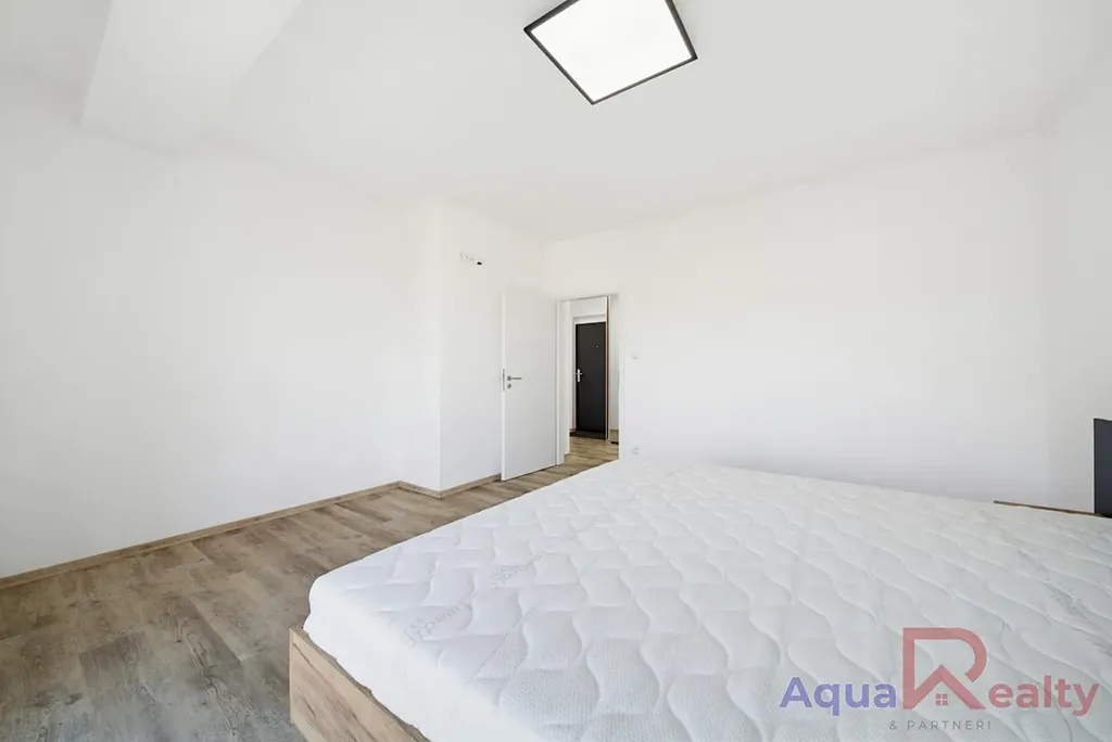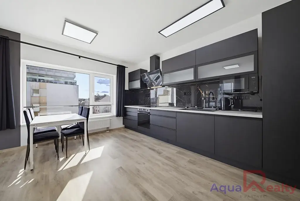 Interiér bytu působí velmi vzdušně a čistě. Dominantou je prostorný obývací pokoj propojený s moderní kuchyňskou linkou v elegantním tmavém designu, která je plně vybavena spotřebiči, včetně myčky, trouby s indukční deskou, mikrovlnné trouby, digestoří a dvoukřídlé lednice. Velká okna zajišťují dostatek denního světla a příjemnou atmosféru. Obývací část je doplněna o pohodlnou sedací soupravu, konferenční stolek a jídelní kout se stolem a židlemi.