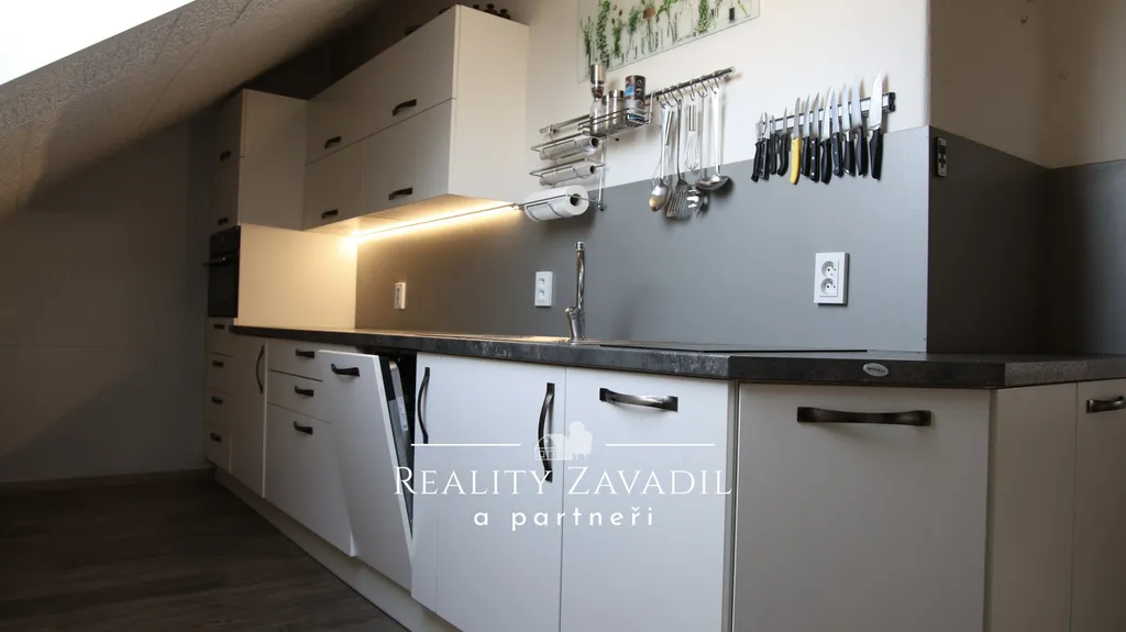 Dominantou domu je centrální chodba s masivním zděným schodištěm vedoucím do podkrovního patra. Horní podlaží prošlo rekonstrukcí – naleznete zde moderní kuchyňskou linku včetně spotřebičů ( indukční varná deska Elektrolux, vestavná pračka Bosch, vestavná myčka Elektrolux, kombinovaná trouba/mikrovlnka a gril Elektrolux ). Dále zrekonstruovanou koupelnu ( sprchový kout, umyvadlo a toaleta ), dvě obytné místnosti sloužící jako obývací pokoj a ložnice i podkrovní místnost vhodnou pro šatnu, pracovnu či malý pokoj. Na chodbě jsou krbová kamna na dřevo, která bezproblémově zajistí tepelný komfort v celém bytě.