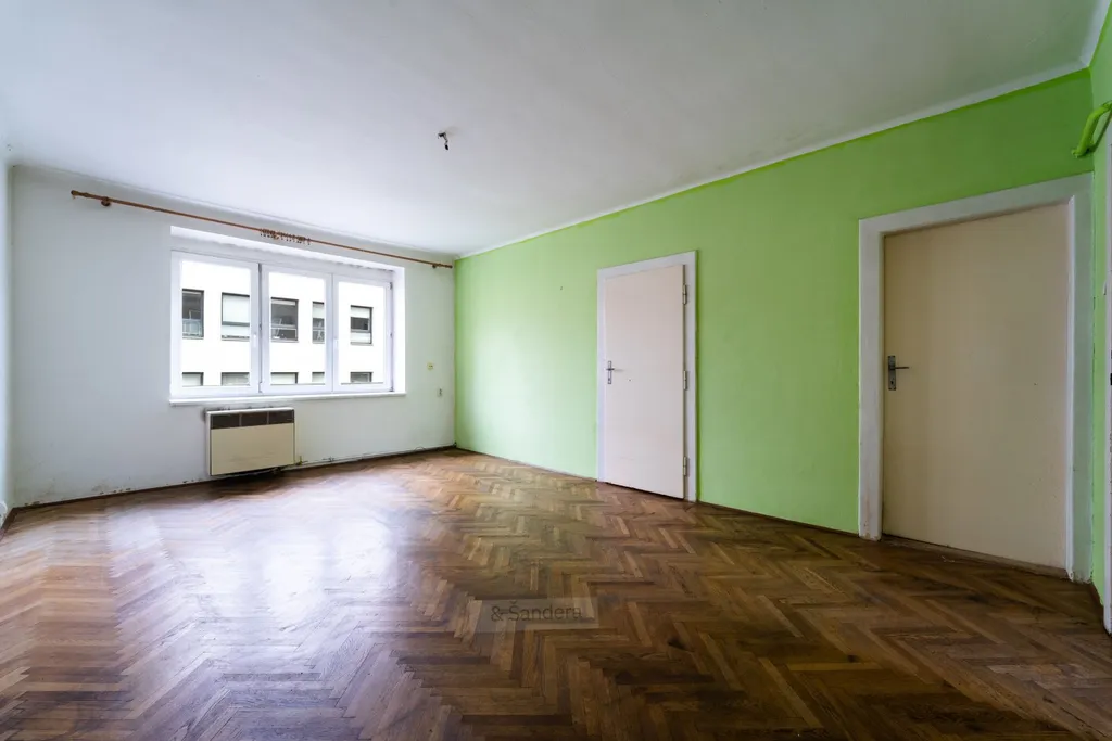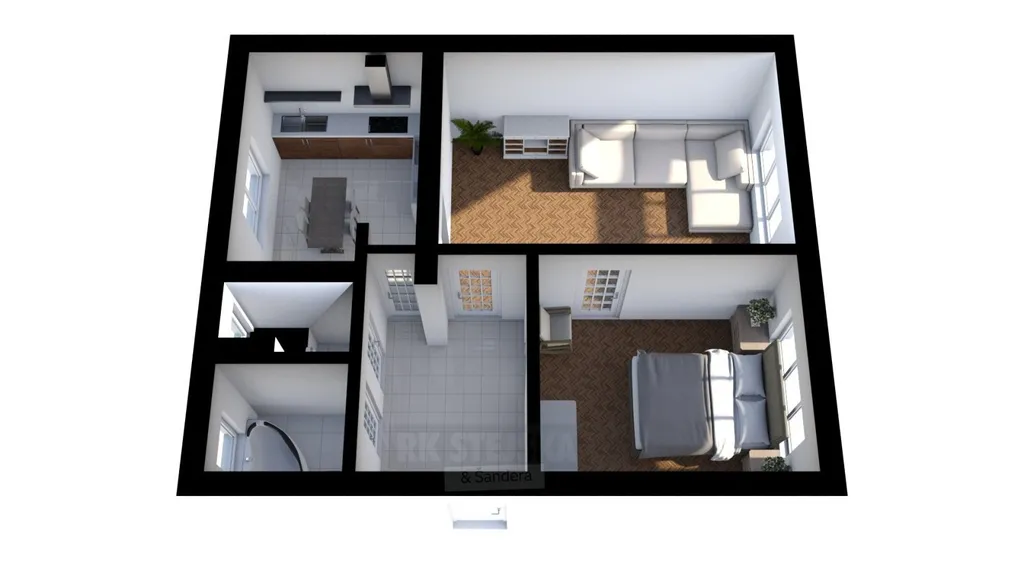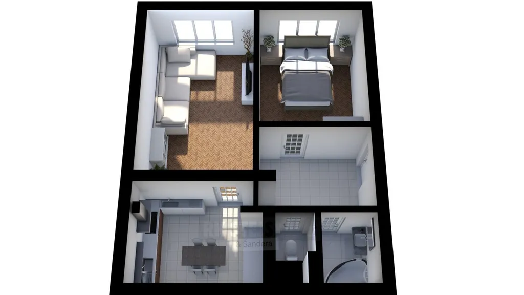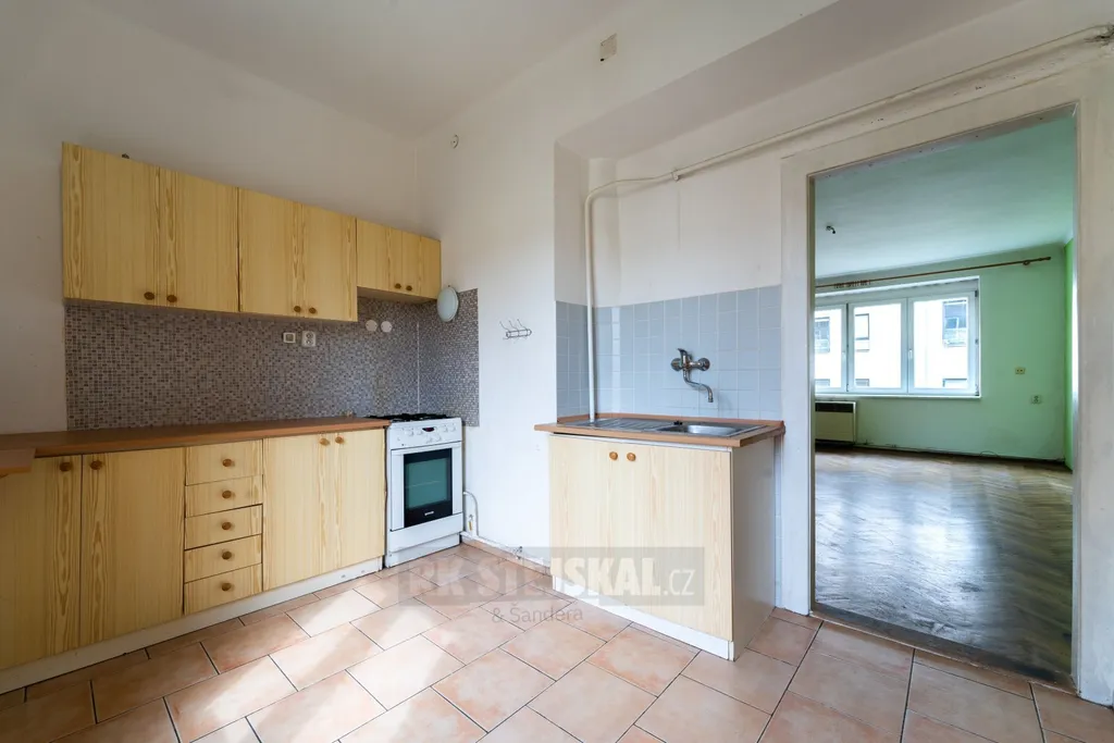 Byt je řešen prakticky a nabízí dva samostatné pokoje, které lze využít jako obývací pokoj a ložnici. Kuchyně je oddělená a poskytuje dostatek prostoru pro vaření i základní úložné možnosti. K dispozici je také koupelna a samostatné WC.