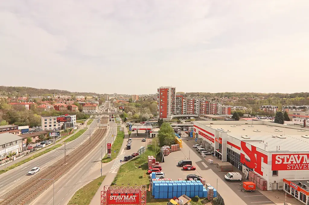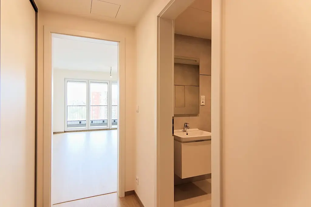 Byt o výměře 37,4 m2 se nachází v 8. nadzemním podlaží budovy s výtahem a skládá se z obývajícího pokoje s kuch. linkou, koupelny s toaletou, vstupní chodby s vestavěnou skříní. Dále je k dispozici parkovací stání a sklepní kóje.