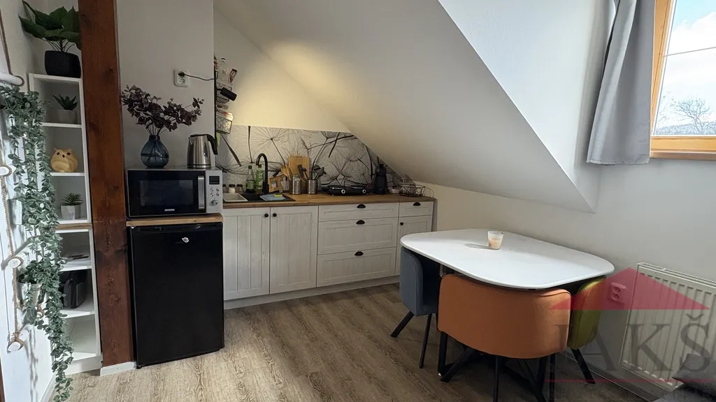 Exkluzivně nabízíme na prodej pěkný, slunný, kompletně vybavený a zařízený apartmán 2 + kk (28,9 m2) s jižní orientací v osobním vlastnictví, ležící v podkroví zděného domu, známý jako obchod a cukrárna „Pampeliška“, stojícího přímo v centru turisticky lukrativní horské obce Prášily, jenž leží v samotném srdci NP Šumava. Unikátní možnost koupě rekreačního bytu v této velmi žádané lokalitě.