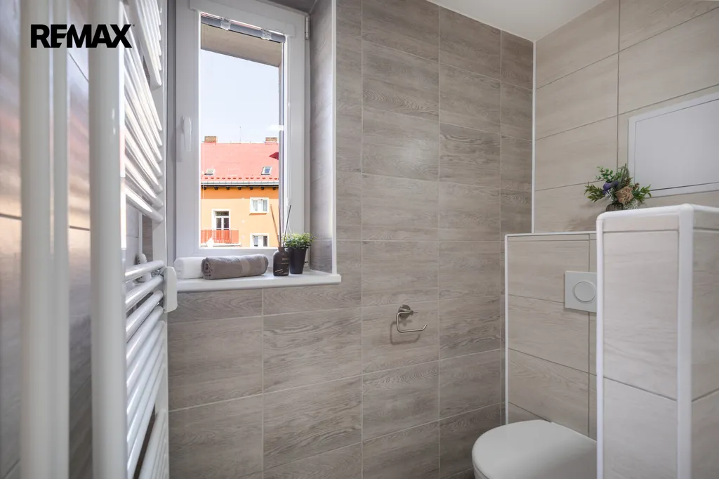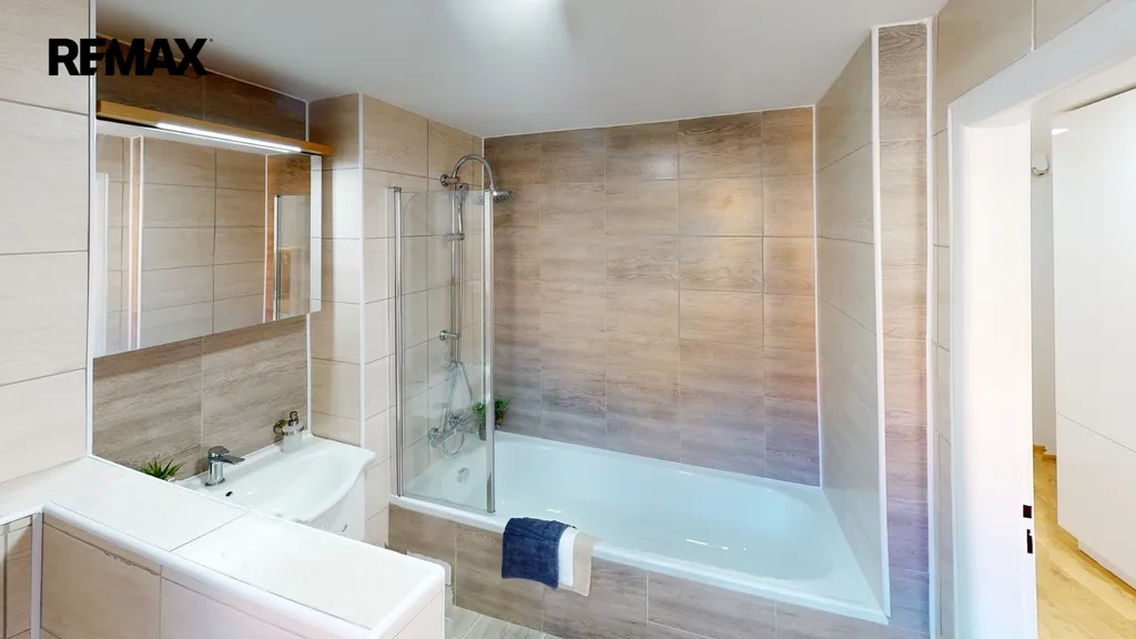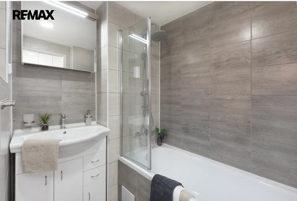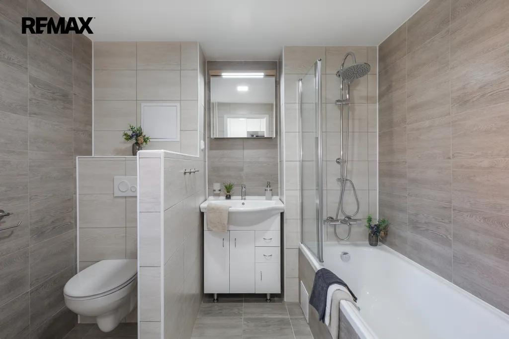 ✅ Koupelna spojená s WC, s vanou se zástěnou pro příjemnou koupel i sprchování, umyvadlem, LED osvětlením s galerkou / okno