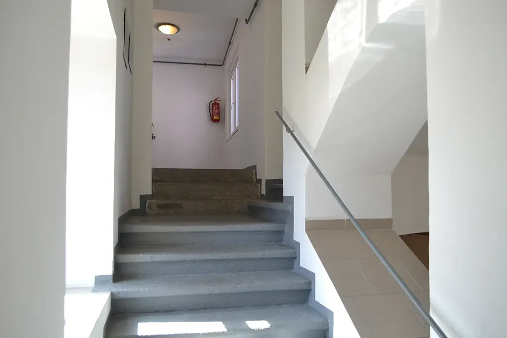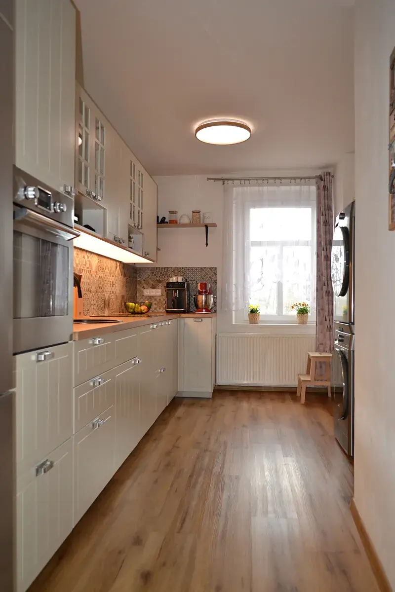 Je situován ve 2. patře historického domu s orientací oken do tří světových stran – jihozápad (ložnice a obývací pokoj), jihovýchod (pokoj) a sever (vstupní chodba a kuchyně). Nemovitost prošla postupnou citlivou renovací od podlahových krytin, štuků stěn, elektroinstalace, topného systému až po nově instalovanou kuchyňskou linku s kvalitními spotřebiči, vyrobenou na míru. Koupelna vybavena vanou, toaleta je samostatně. Podlahy kvalitní vinilové, instalace v r. 2023.