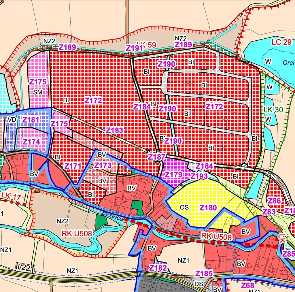 • Ochranné režimy a limity: venkovní vedení VN 22 kV, meliorace, kanál pro odvedení povrchové vody, veřejně prospěšná stavba