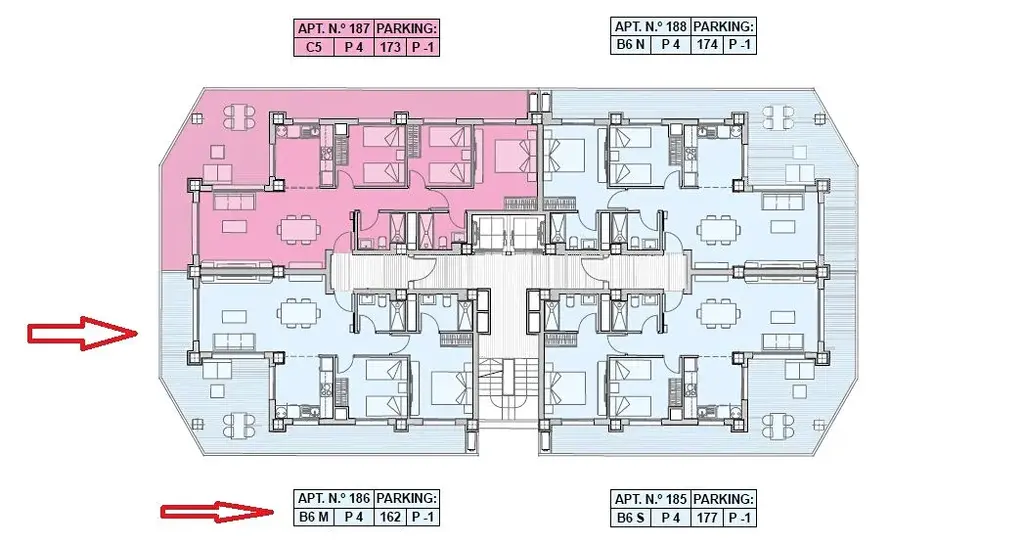 Apartmán SPVAM3_186 se nachází ve čtvrtém patře. Má obytnou plochu 76 m² a je rozdělaný do dvou ložnic, dvou koupelen, prostorného obývacího pokoje s jídelnou a otevřenou kuchyní a velké terasy 37,7 m2. Celková plocha je tedy 113,85 m2. Kromě toho se prodává částečně zařízený a plně vybavený, s klimatizací a podzemním parkovacím místem #162 v ceně.