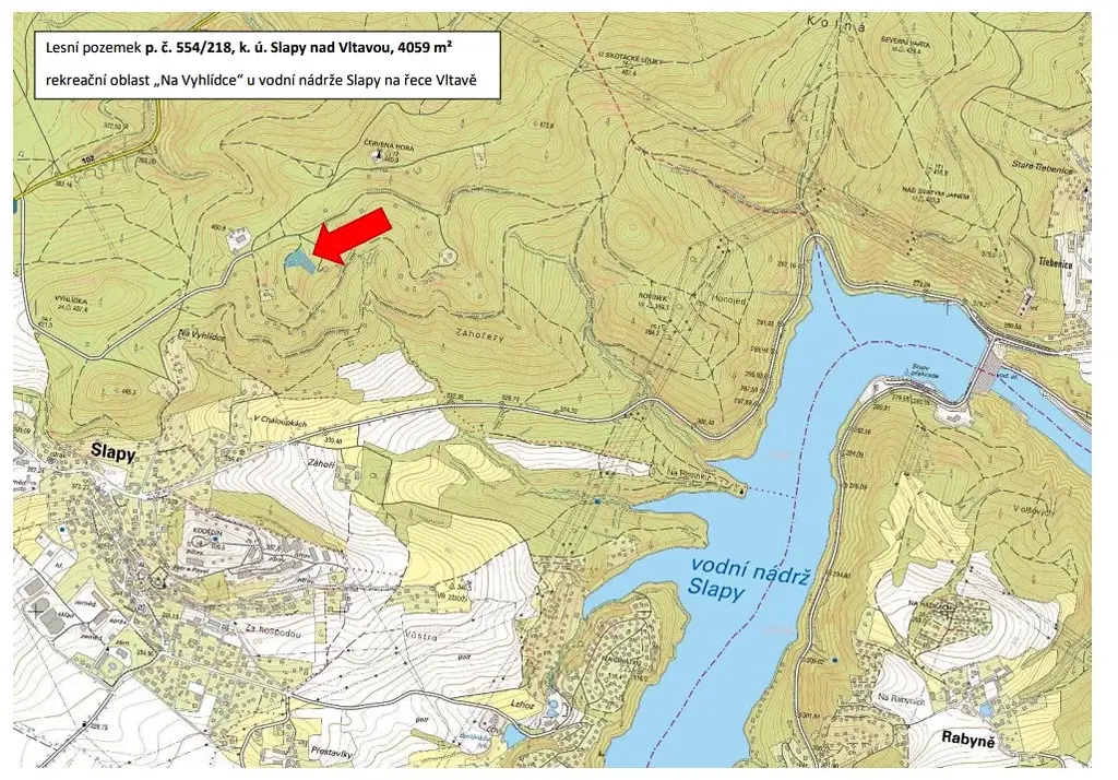 Jedná se o lesní pozemek v rekreační lokalitě Na vyhlídce, obec Slapy, na řece Vltavě, uprostřed pozemku se nachází rodinný dům č. p. 198, který je součástí p. č. st. 235, k. ú. Slapy nad Vltavou (jiný vlastník). Dle Lesního hospodářského plánu se jedná o les hospodářský, převažuje však rekreační funkce lesa nad produkční. Užívání nezbytného okolí rodinného domu č. p. 198 je ošetřeno nájemní smlouvou do 31. 12. 2028. Pozemek je historicky oplocen, přístupný kovovou bránou, uzamčen. V pozemku jsou uloženy inženýrské sítě (vodovod, přípojka NN, jímka), sloužící rodinnému domu Slapy č. p. 198, které nejsou smluvně ošetřeny věcným břemenem, rovněž přístup k výše uvedenému rodinnému domu není smluvně ošetřen, předpoklad vymezení rozsahu věcných břemen viz GP č. 591-108/2022. Obec Slapy nemá schválen nový územní plán, v současné době není pozemek zastavitelný.