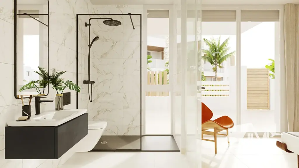 Vila nabízí dispozici se třemi ložnicemi a třemi koupelnami, díky čemuž poskytuje dostatek prostoru i soukromí pro rodinu i hosty. Otevřený obývací prostor s kuchyní o velikosti 35 m² přirozeně propojuje interiér s exteriérem a vytváří místo, kde se odehrávají společné chvíle, od ranní kávy po večerní posezení. Kvalitní materiály, jako porcelánové podlahy, vestavěné skříně a kompletně vybavená kuchyně se spotřebiči, doplňuje klimatizace a podlahové vytápění v koupelnách, které zajišťují komfort v každém ročním období.