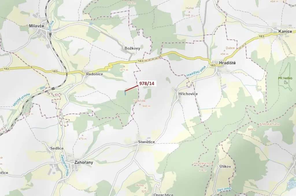 Lesní pozemek o výměře 2762 m2, parcelní číslo 978/14, podíl 1/1, katastrální území Radonice u Milavčí, obec Milavče, obec s rozšířenou působností Domažlice, okres Domažlice, Plzeňský kraj. Po těžbě.
