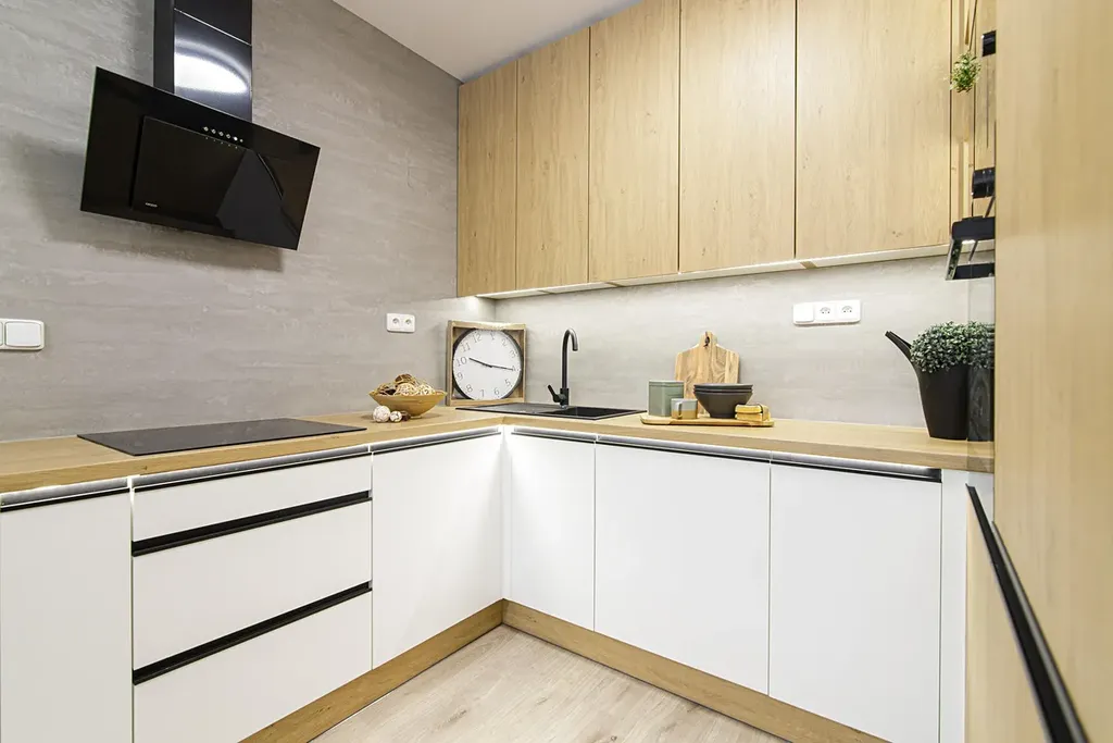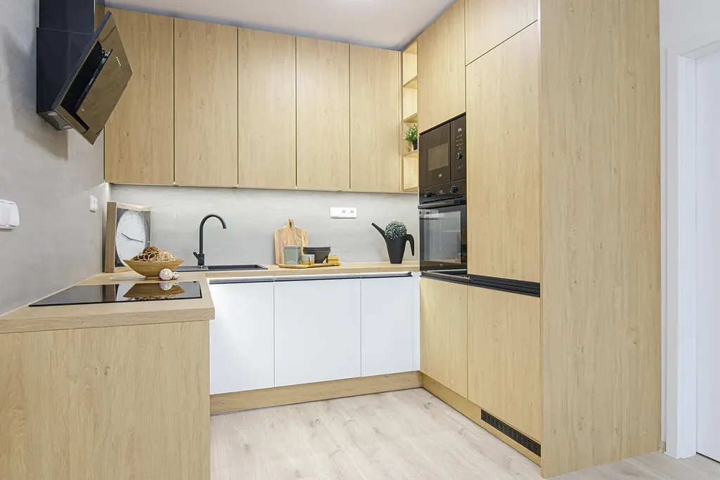 Byt disponuje obytnou kuchyní o vel. 14 m2 s novou kuchyňskou linkou do tvaru U v kombinaci bílé barvy a dekoru dřeva s vestavěnými spotřebiči lednice s mrazákem, myčka, varná deska, elektrická a mikrovlnná trouba. Kuchyňskou linku ocení zejména hospodyňky díky velké pracovní ploše a úložnému prostoru.