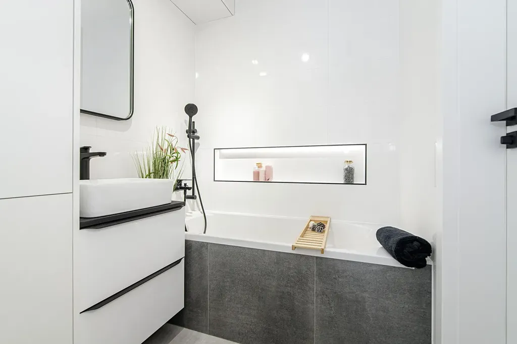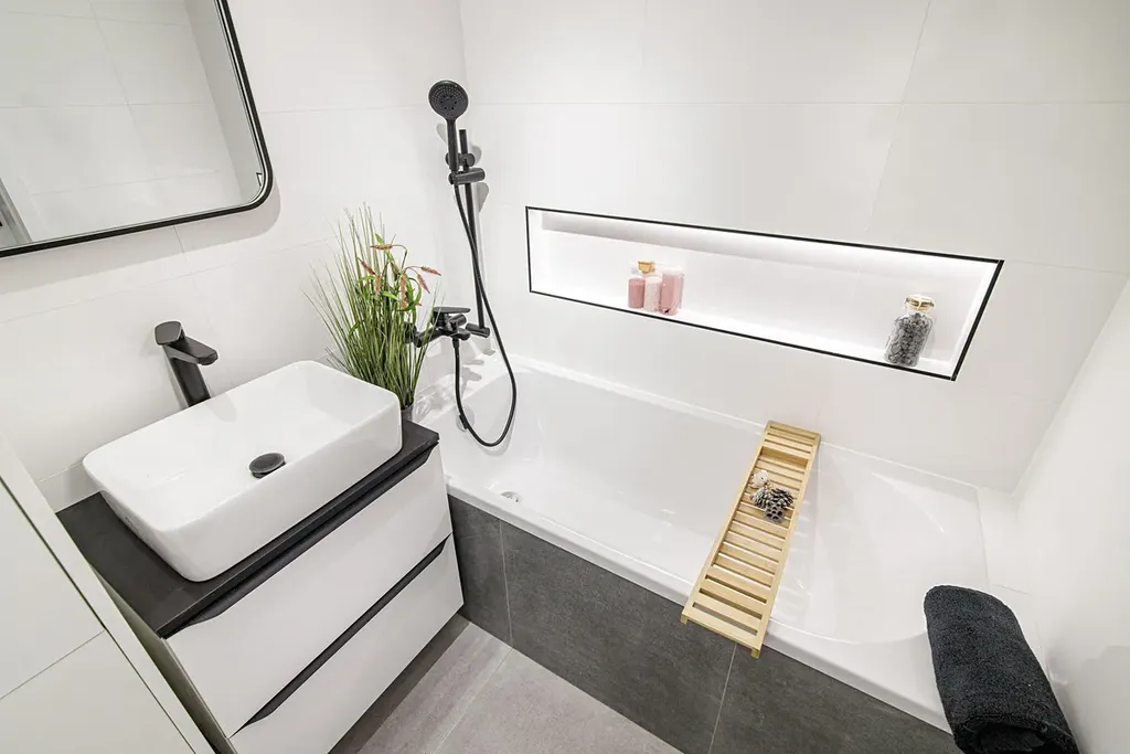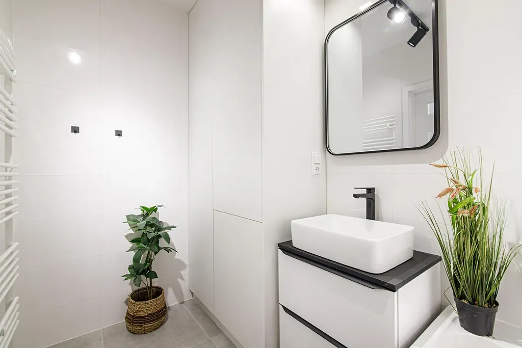 Koupelna včetně obkladů a dlažby, které k sobě ladí, nová sanita, koupelnová skříňka na míru s úložným prostorem a prostor na umístění pračky.