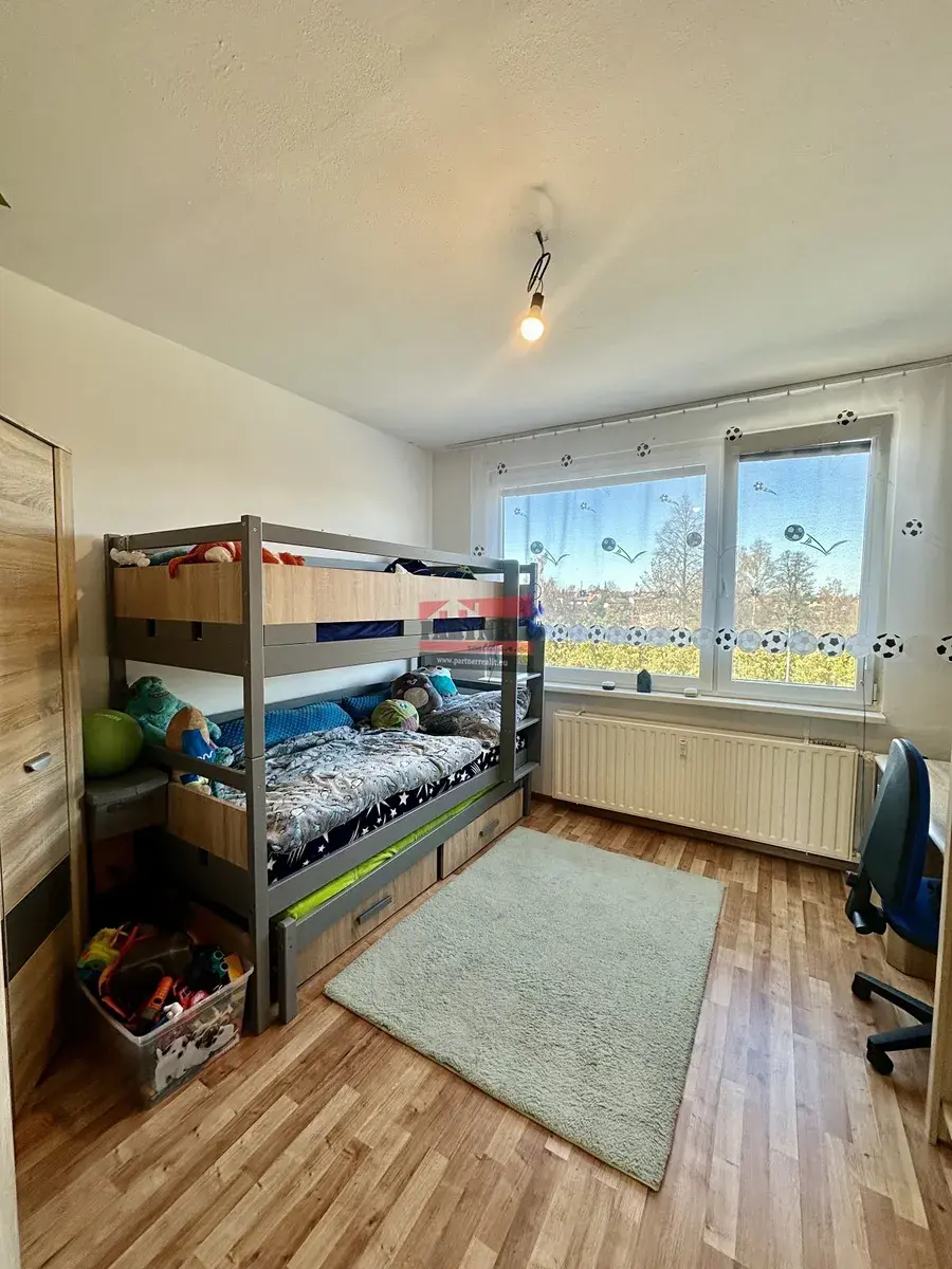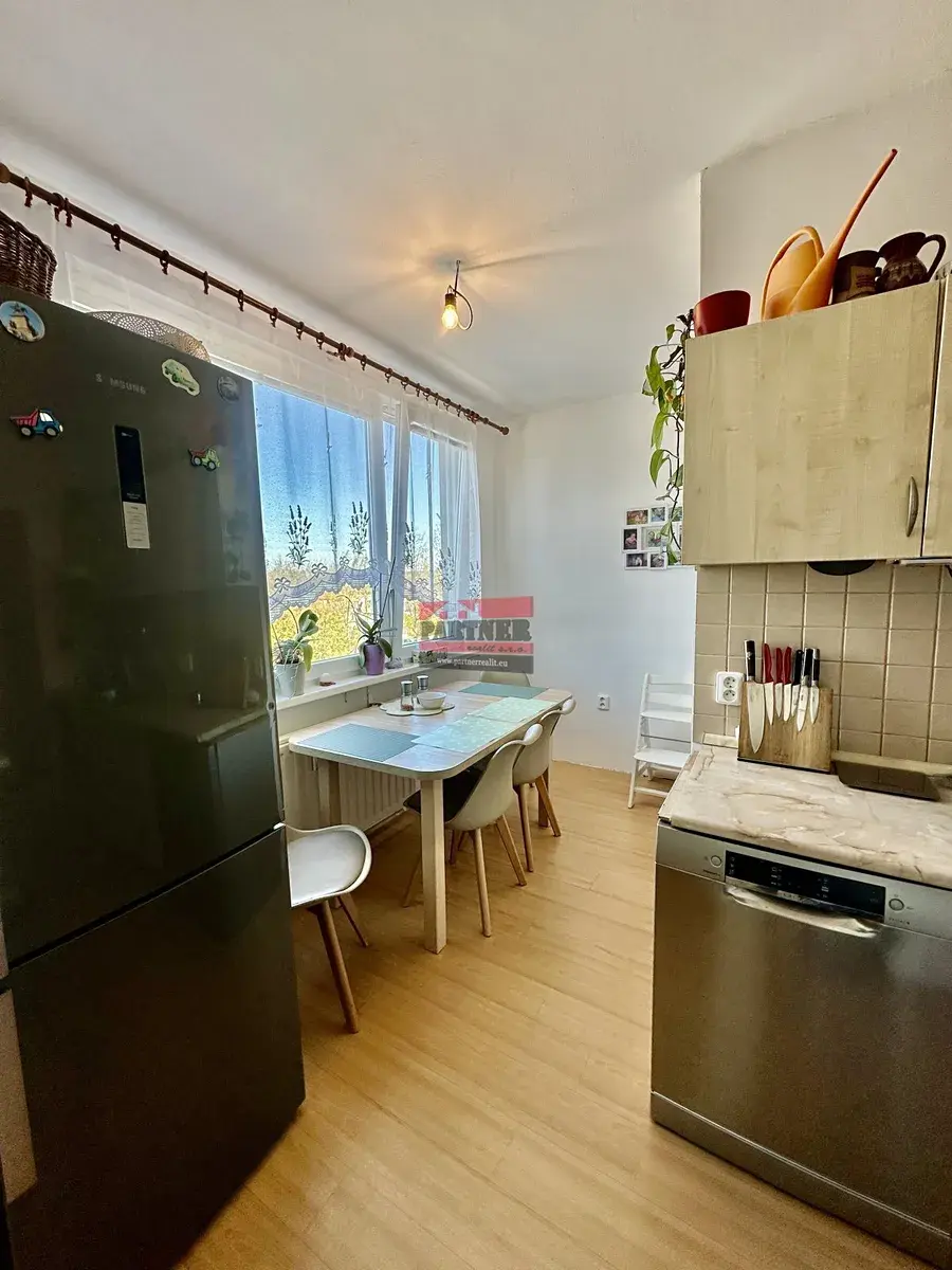 Byt nabízí praktické uspořádání místností: kuchyně (4,50m²), jídelna (6,55m²), prostorný obývací pokoj (20,60m²) se vstupem na lodžii orientovanou na jih, ložnice (12,32m²), dětský pokoj (12,32m²), hala (7,92m²), předsíň (5,17m²), koupelna (2,56m²) a samostatné WC (0,97m²). Kuchyně, ložnice i dětský pokoj jsou orientovány na sever, což zajišťuje příjemné klima i v letních měsících.
