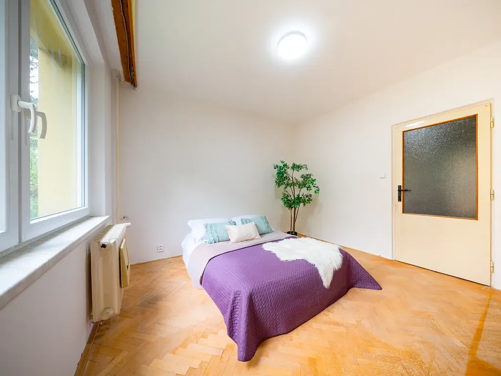 Ve všech ložnicích jsou zachované dřevěné parkety. Byt jako bonus nabízí příjemný výhled do zeleně. Celý dům je obklopen stromy, takže i v létě je tu příjemné klima.
