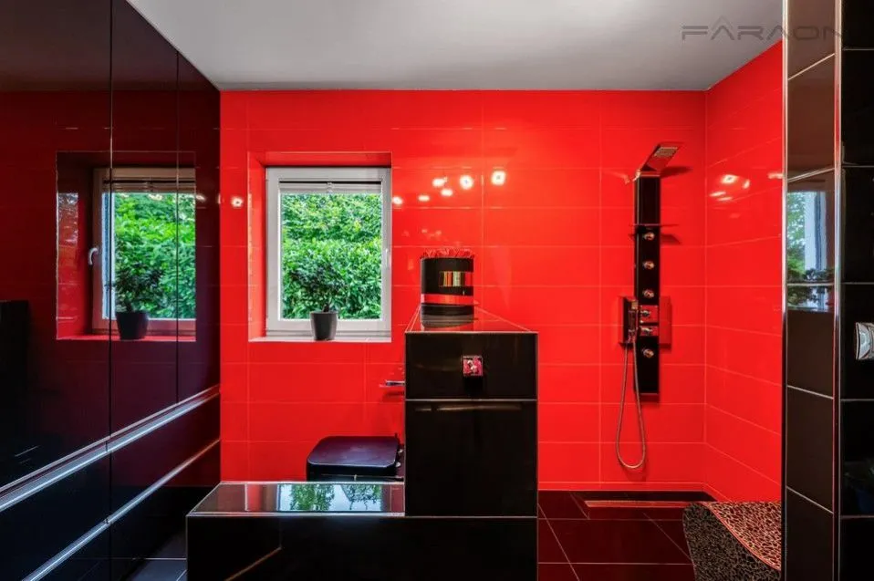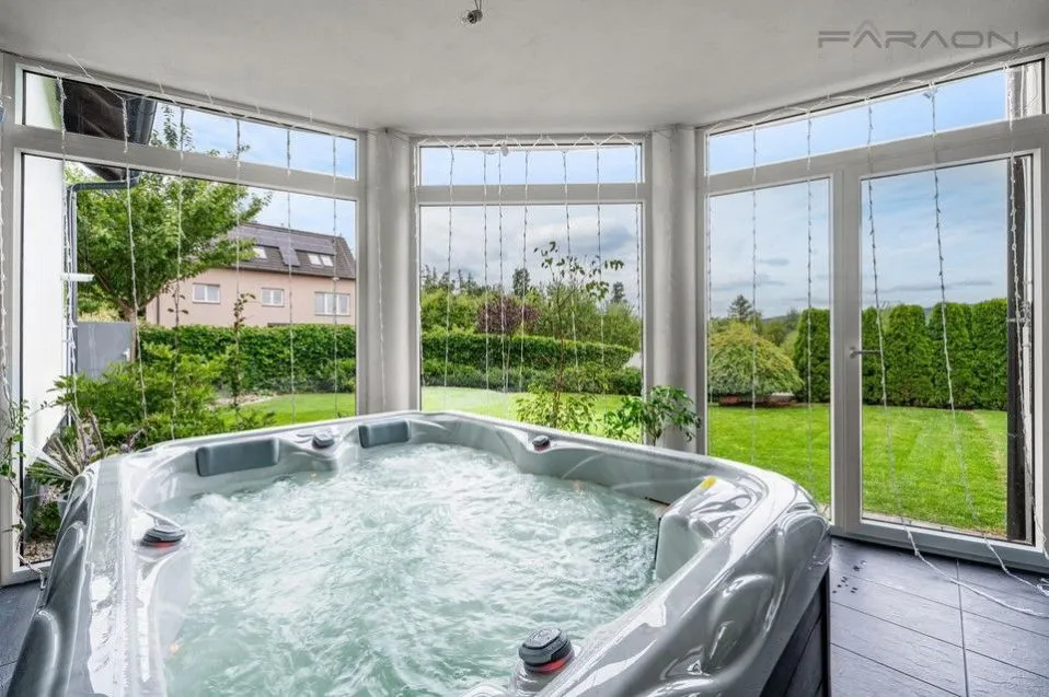 Vytápění domu zajišťuje moderní tepelné čerpadlo a plynový kotel s podlahovým vytápěním v přízemí. Okna jsou plastová s hliníkovými rámy a elektrickými žaluziemi. Vila nabízí tři prostorné vestavěné šatny a dvě koupelny vybavené luxusními prvky, včetně sauny, hydromasážní vany a vyhřívací lavice ve sprše. Exteriér doplňuje zastřešený a vyhřívaný bazén a dětský domek o velikosti cca 25 m. Dům je napojen na městský vodovod a kanalizaci.