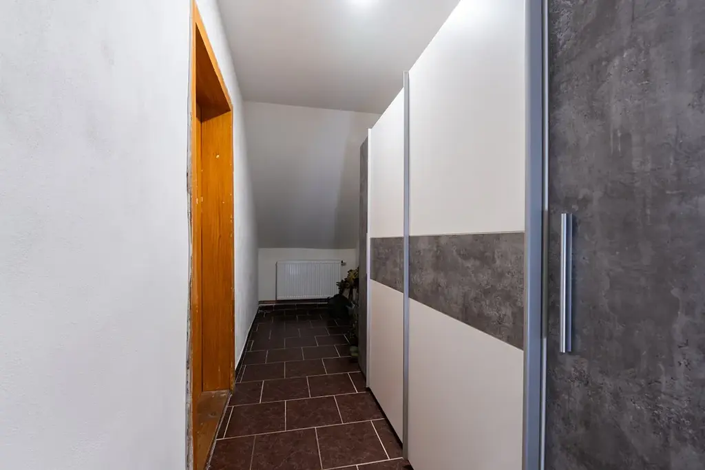Ve 2. nadzemním podlaží jsou dva pokoje propojené koupelnou, chodba a další prostor podél celé jedné strany domu, aktuálně využívaný pro uskladnění věcí, s možností úpravy dle vlastních potřeb.