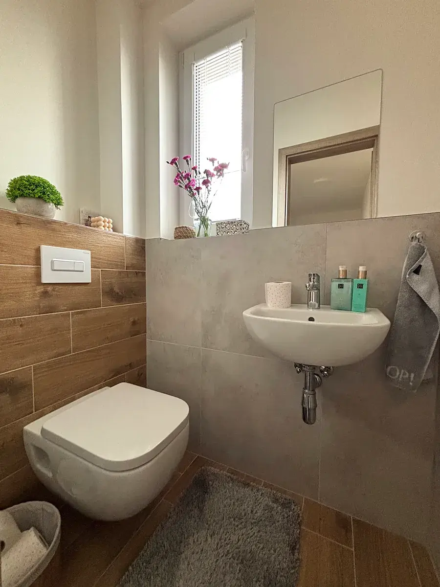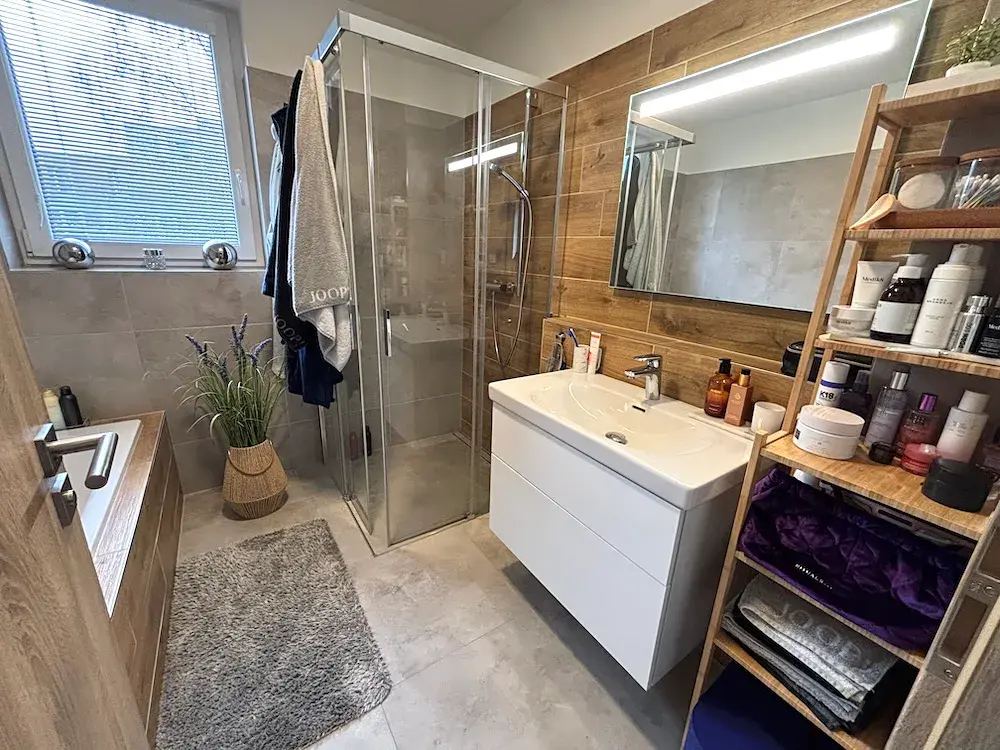 2.NP: 3 pokoje, koupelna s vanou a sprchovým koutem, WC s umyvadélkem.