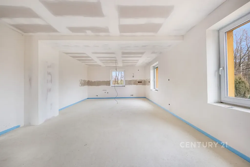 1. nadzemní podlaží (Srdce domova): Kompletně zrekonstruovaný prostor připravený pro budoucí obývací pokoj s kuchyňským koutem a ostrůvkem. Najdete zde i prostor pro koupelnu s přípravou na vanu, sprchový kout a WC.