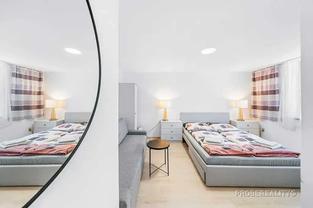 4 dvoulůžkové pokoje (1 s vlastní koupelnou a WC, ostatní sdílejí koupelnu s WC) a 2 kuchyňky na patře.