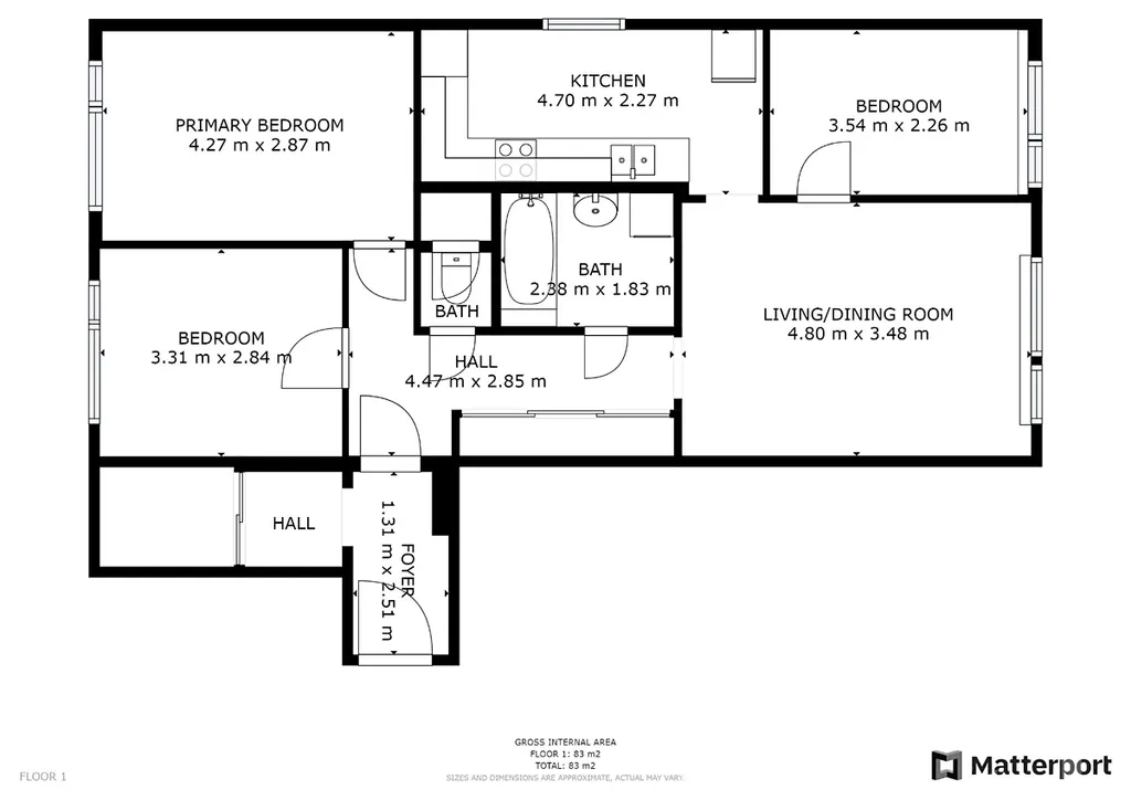 Layout: Obývací pokoj , 3 samostatné ložnice , oddělená kuchyně , koupelna s vanou a samostatná toaleta.