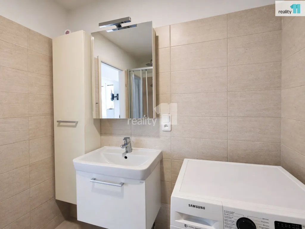 Velkou předností bytu je otevřený prostor mezi kuchyní a pokojem, díky kterému působí interiér vzdušně, svěže a příjemně. Byt je kompletně zařízený, takže nabízí pohodlí okamžitého nastěhování bez nutnosti dalších investic do vybavení. Součástí pronájmu jsou také spotřebiče včetně lednice s mrazákem, horkovzdušné trouby a mikrovlnné trouby.