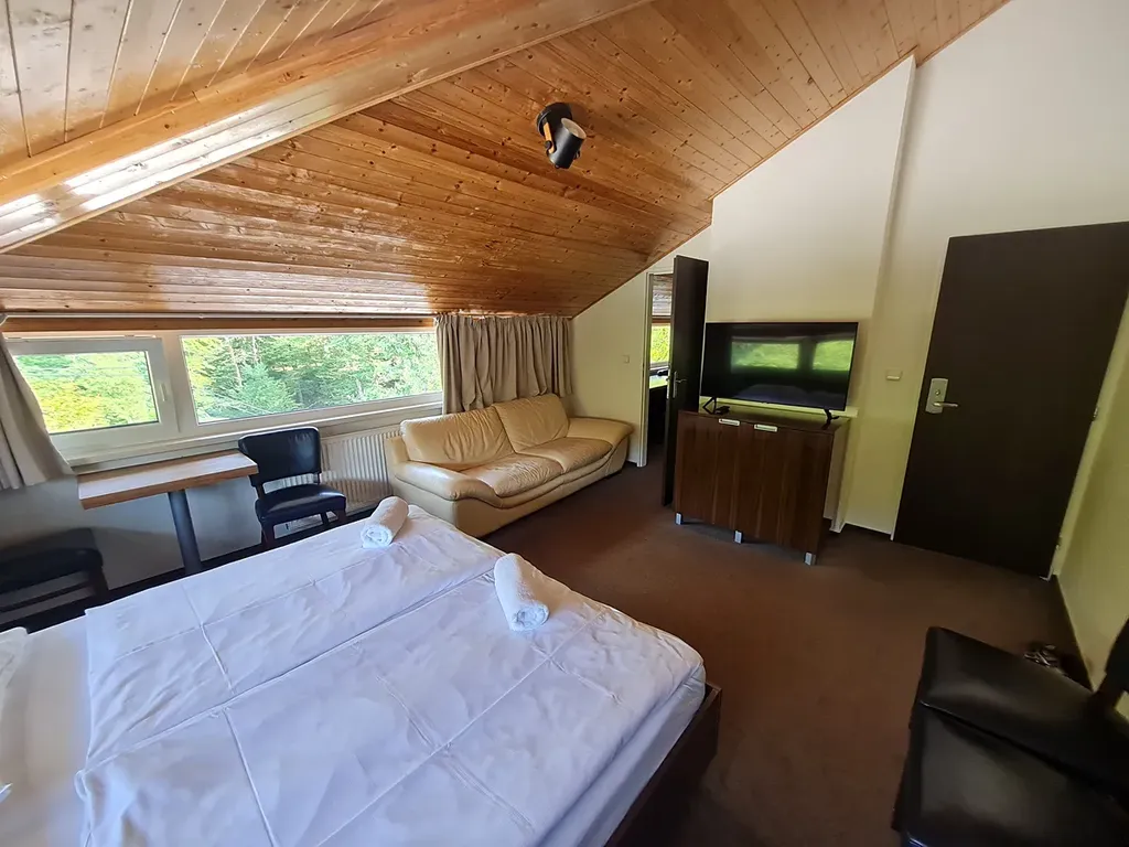Ve 3.NP v podkroví mají své místo další tři apartmány, jeden čtyřlůžkový (dvě místnosti), jeden třílůžkový (jedna místnost) a jeden dvoulůžkový, všechny s koupelnou a WC.