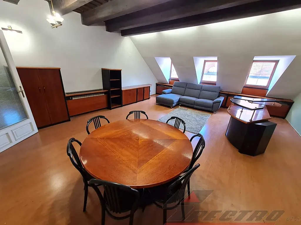 Nabízíme k pronájmu velmi reprezentativní luxusní nebytové prostory přímo v centru Plzně, Pražská ul. Nachází se v renesančním domě u nám. Republiky v podkroví ve 3.patře. Jedná se o 2 kanceláře s mezonetem o celk. výměře 102 m2 + terasa, vlastní kuchyňka a WC. Z předsíňky se vchází do místnosti o rozloze 25,78 m2 (recepce, sekretariát), z té je vstup do kuchyňky (4,18 m2) a prosklenými dveřmi se vejde do rozlehlé místnosti o vel. 38,33 m2, ze které vede dřevěné schodiště do mezonetového prostoru o vel. 37,56 m2, z něhož přístup na terasu o vel. 56 m2. Samostatná toaleta se nachází na vstupní chodbě. Vše vyznačeno na přiloženém nákresu - zeleně označené plochy. Nábytek lze v případě zájmu odstranit. Prostory mají vlastní zabezpečovací zařízení. Nájemné: 14.700 Kč. Energie a služby: 4.000 Kč (EE, topení, voda, úklid společných prostor a odvoz odpadků). Kauce 20.000 Kč. Provize 1 nájemné. Volné ihned.