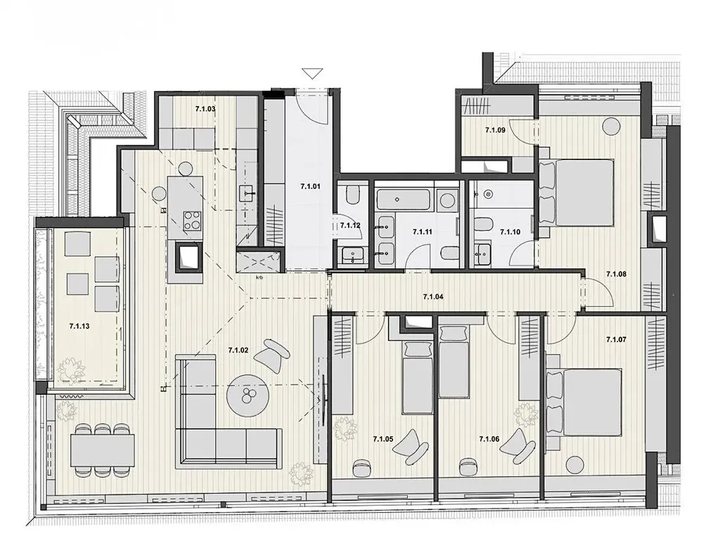K nemovitosti náleží terasa o velikosti 9,78 m², ideální pro relaxaci nebo práci na čerstvém vzduchu. K dispozici je také možnost dokoupení garážového stání a sklepa, což dále zvyšuje komfort života v této prémiové lokalitě.
