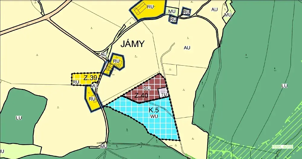 Pozemek je určen pro rodinné a bytové domy s možností podnikání.