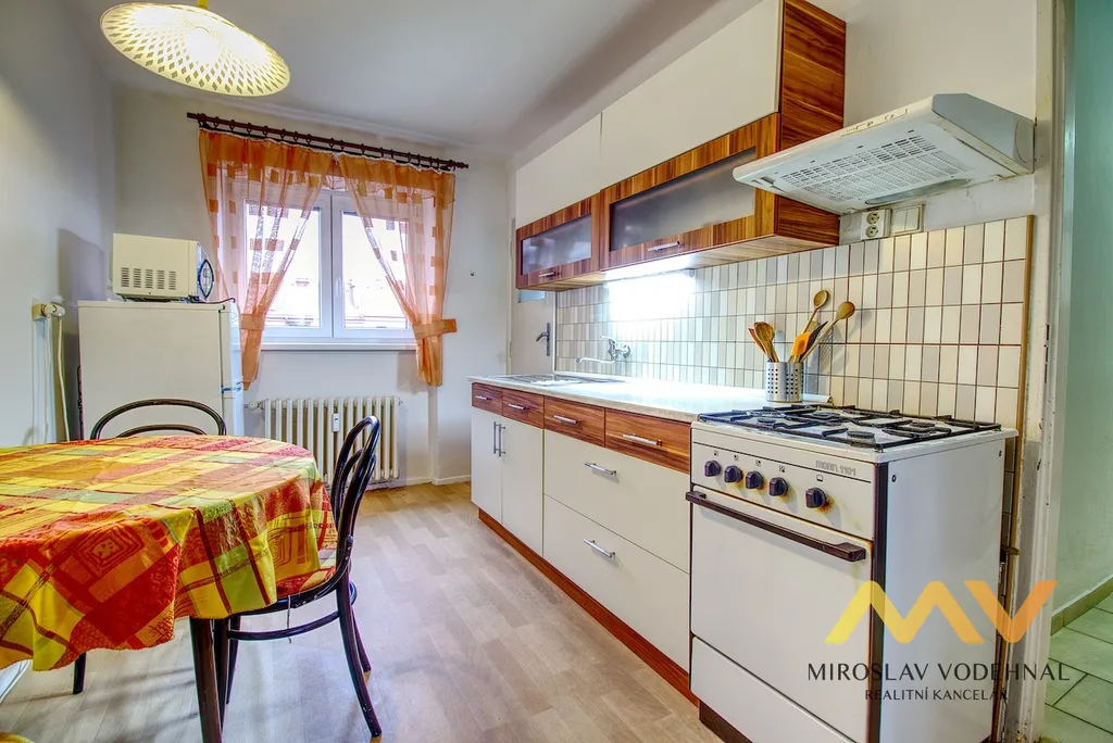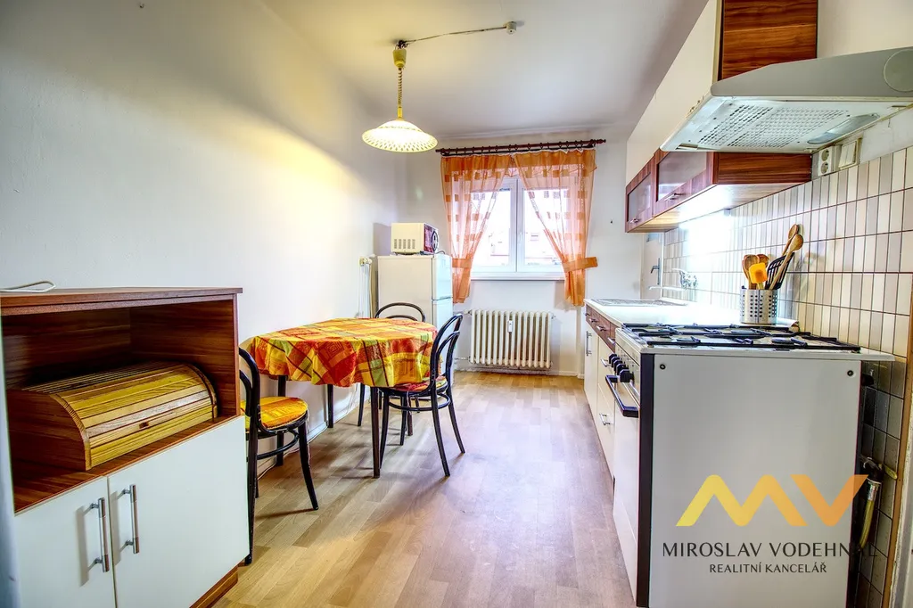 Byt je dispozičně řešen jako kuchyň se spíží, dva samostatné pokoje, koupelna s vanou, samostatné WC, předsíň a komora. Součástí vybavení je sedací souprava, jídelní stůl se židlemi, nová kuchyňská linka s plynovým sporákem, obývací stěna, manželská postel, šatní skříně, pracovní stůl, lednice, mikrovlnná trouba, pračka. Byt může být po dohodě vyklizen. K bytu náleží menší balkón 1 m2. Sklep není k dispozici.