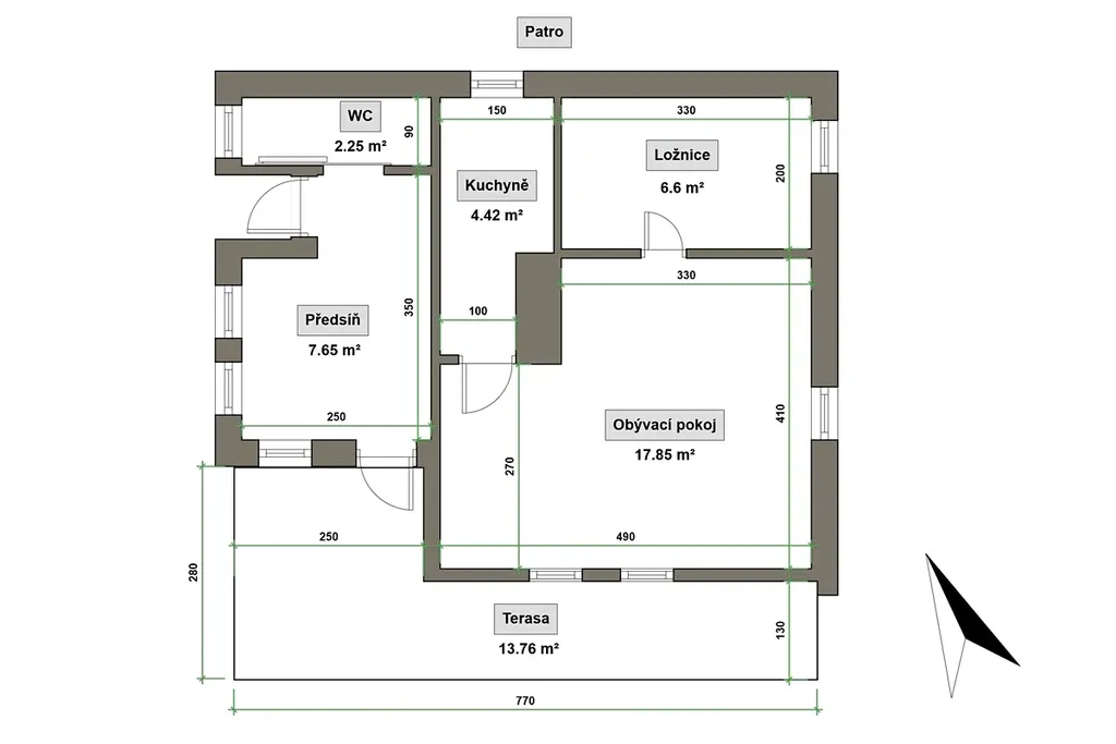 V přízemí se nachází skladovací prostor, koupelna, samostatné WC a chodba. V patře je situován obývací pokoj, ložnice, předsíň, druhé WC a menší kuchyně. Dominantou patra je krásná terasa s příjemným výhledem na okolní přírodu.