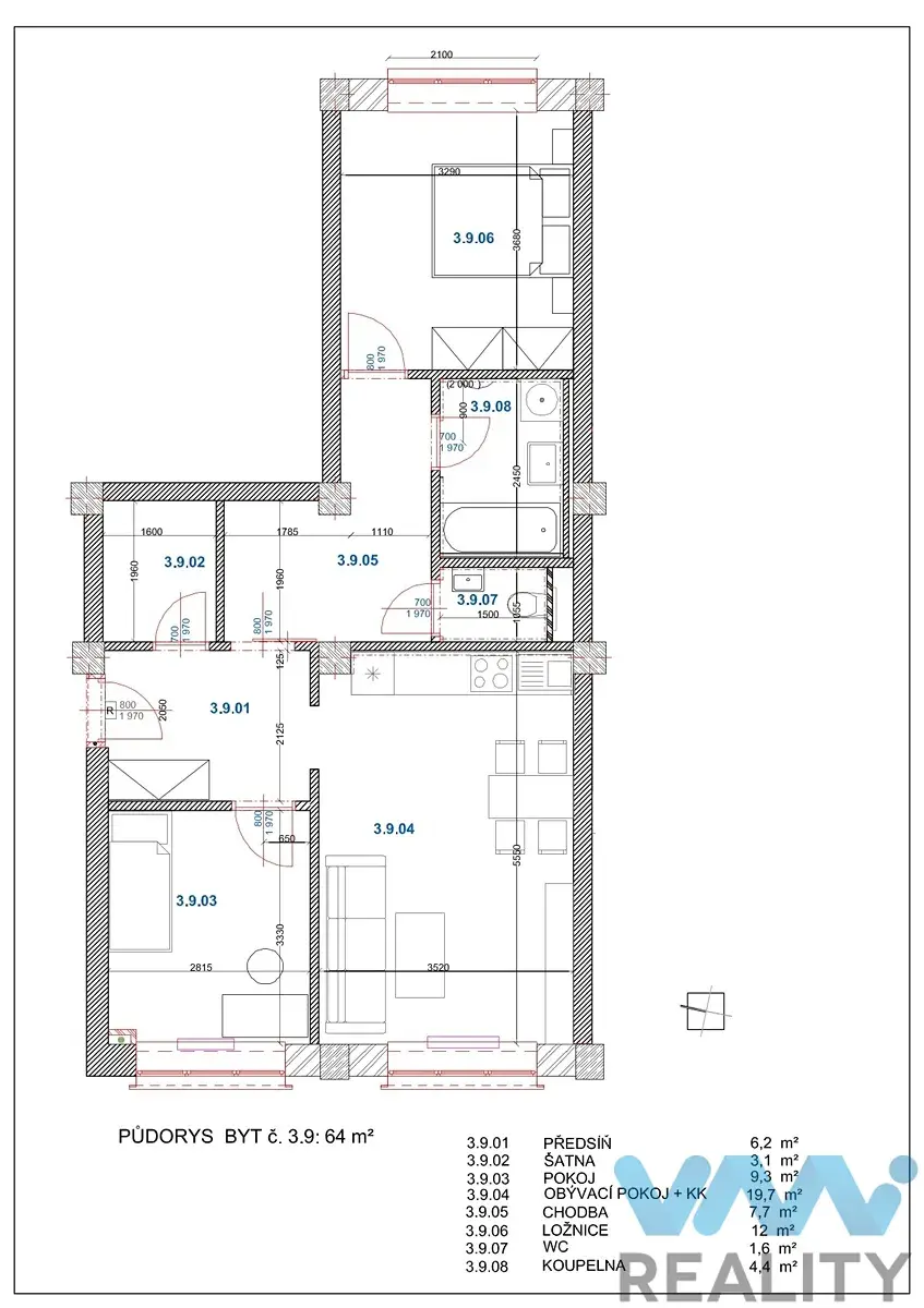 Kuchyň je spojená s obývacím pokojem, další dva pokoje jsou samostatné. Byt má samostatnou komoru/šatnu. Kuchyň je vybavená linkou včetně vestavěných spotřebičů (myčka, sklokeramická deska, elektrická trouba, digestoř, bez lednice). Koupelna a toaleta jsou samostatné, v koupelně je sprchový kout a umyvadlo se skříňkou.