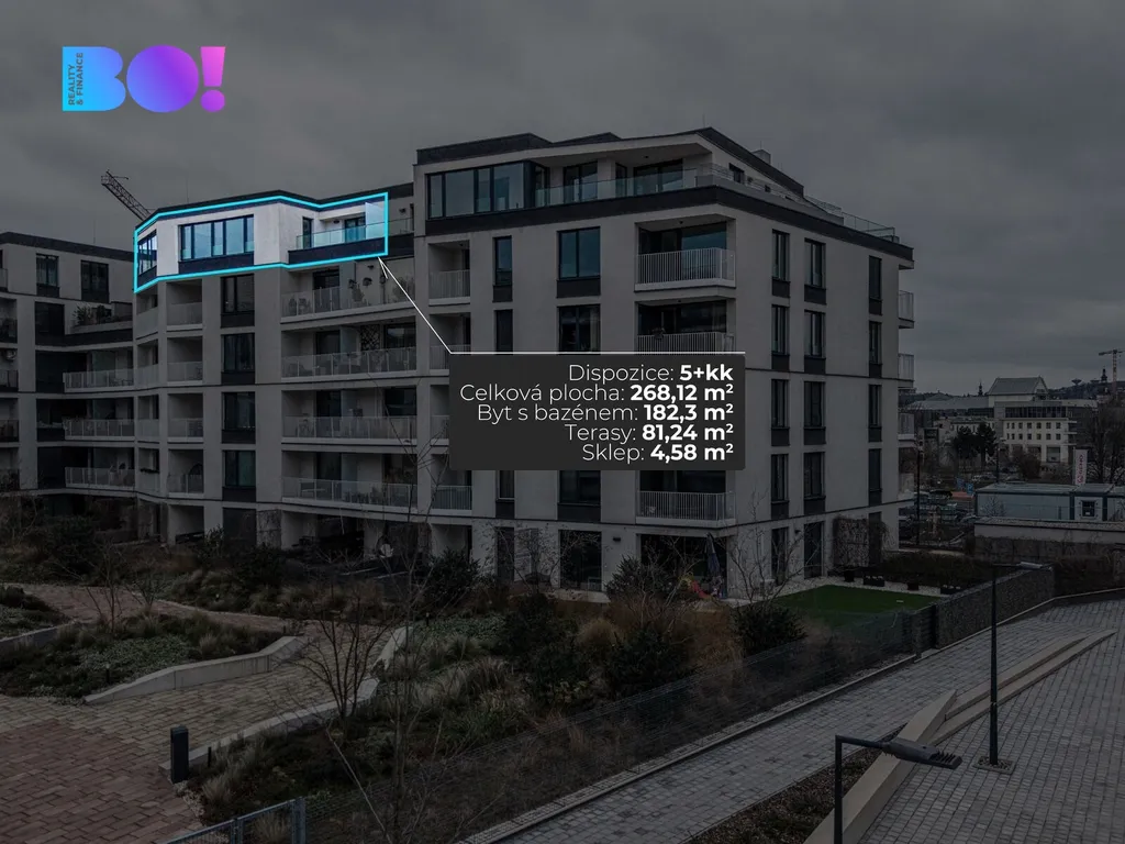 Byt s bazénem 182,3 m² s terasy 81,24 m² a sklepem 4,58 m² je šikovně dispozičně řešen tak, aby nabízel dostatek prostoru pro komfortní bydlení i reprezentativní pracovní zázemí.