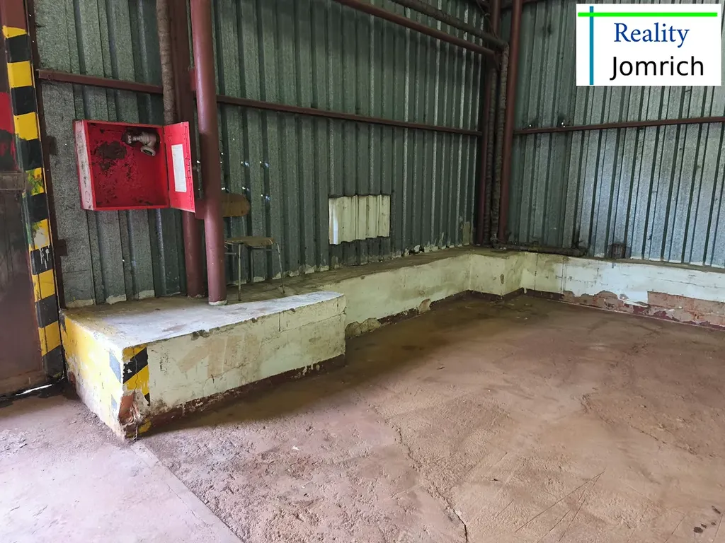 Hlavní hala o zast. ploše 700 m2, obestavěný prostor je 5.135 m2, rozměrů 37 x 19 m, výškou 5,80 m, je převážně zděná s betonovou podlahou, oplechovaná vlnitým plechem, a je složená ze tří částí: 18 x18, 9x18 a 10 x18. V každé sekci je přívod elektřiny 220/380 V a rozvody na hydrant. S halou tvoří funkční celek zděná garáž o zast. pl. 25 m2 a nákladová i nájezdová rampa.