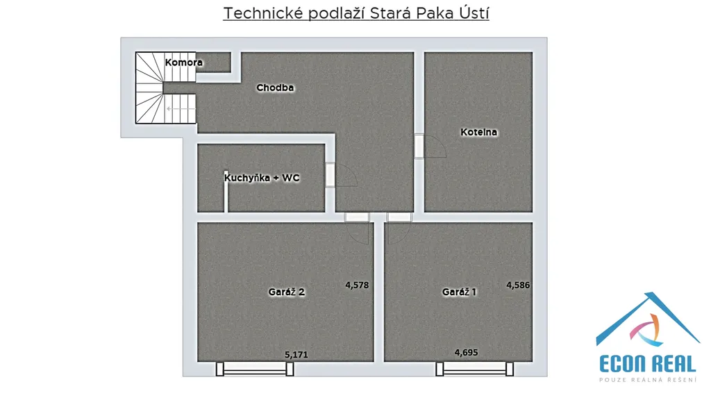 1PP slouží jako technické zázemí: dvě samostatné garáže s novými vraty, technická místnost, prádelna a též kotelna.