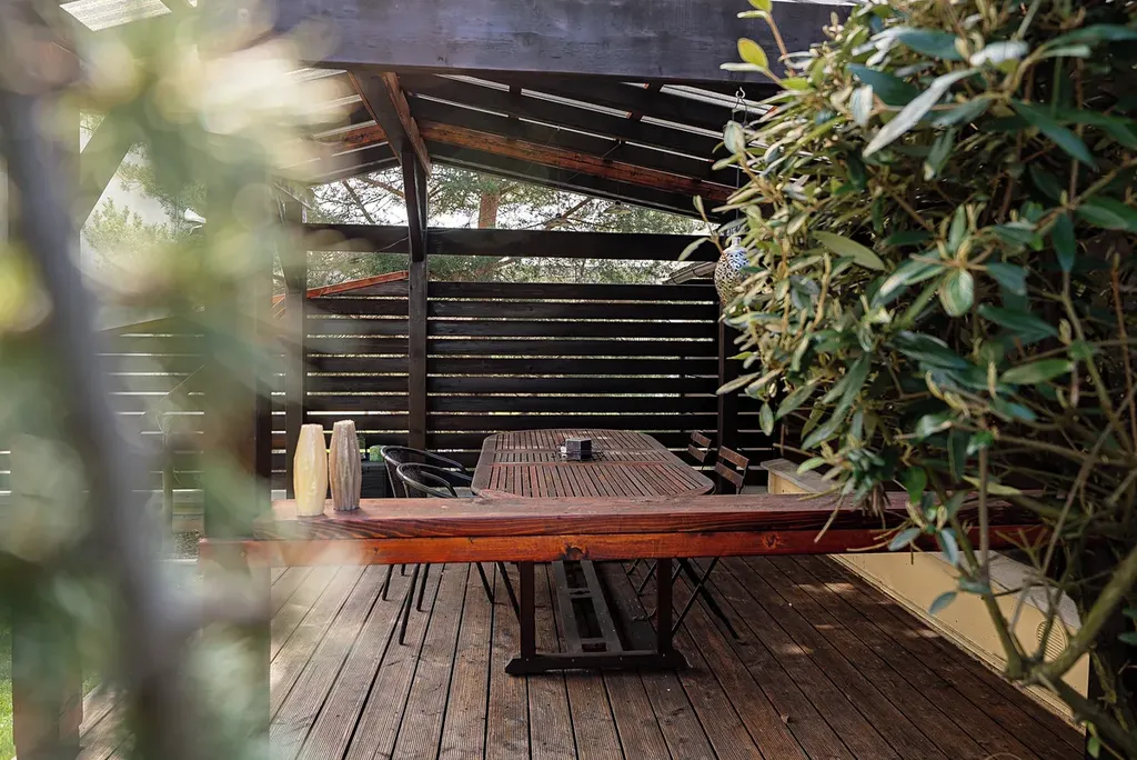 Skutečným unikátem je přímý vstup z obou pokojů na zahradu (179 m²), která nabízí dvě terasy. Tento venkovní prostor poskytuje ideální zázemí pro relaxaci i aktivní trávení času – najdete zde pergolu, zahradní domek i dostatek prostoru pro grilování či hraní dětí. Udržovaná zeleň a vzrostlé stromy zajišťují příjemné soukromí.