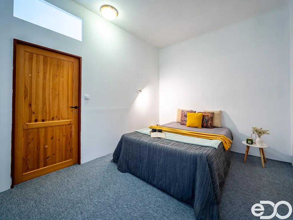 Dispozice bytu nabízí prostorný obývací pokoj, samostatný pokoj vhodný jako dětský pokoj nebo pracovna a průchozí ložnici bez okna, která je přístupná z obývacího pokoje i z koupelny.