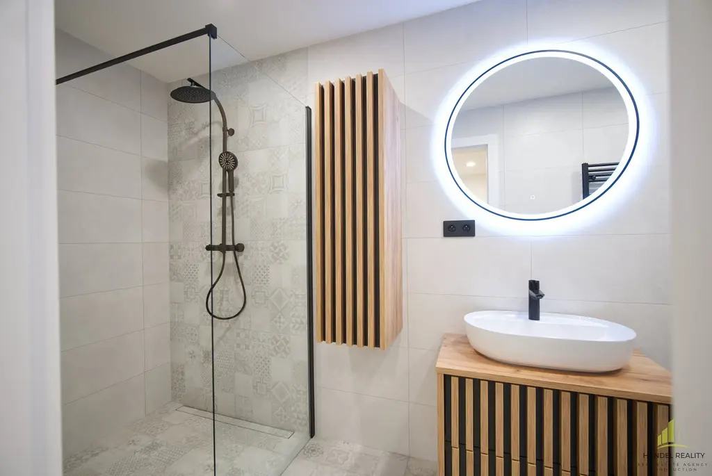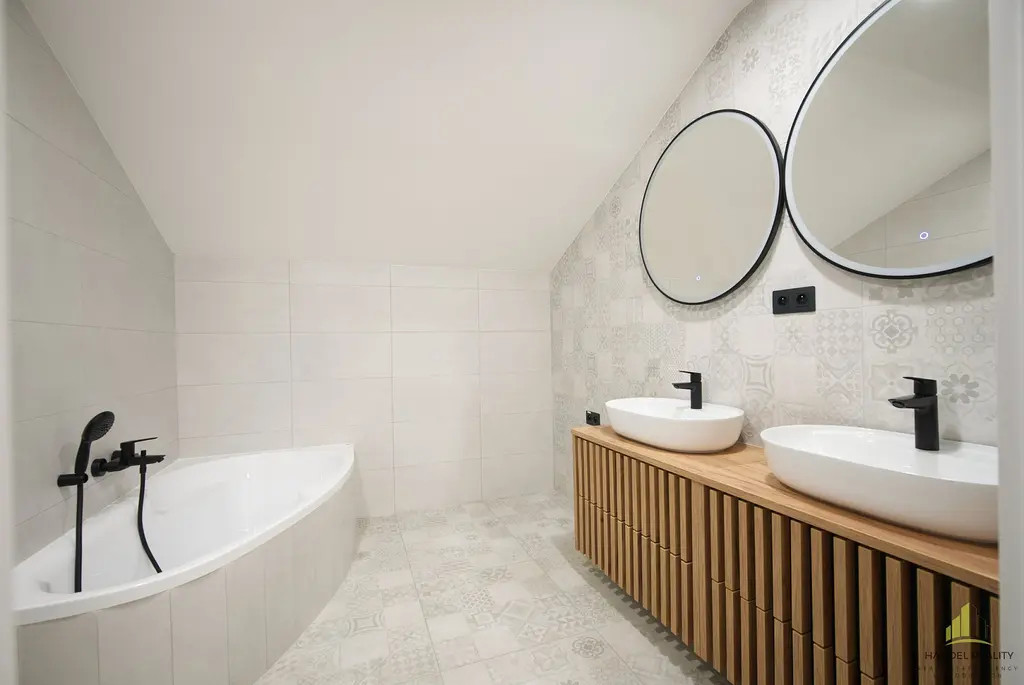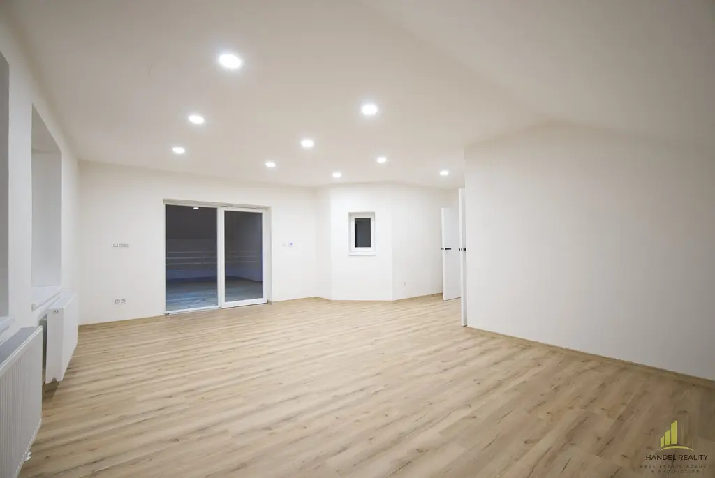 V přízemí se nachází prostorný obývací pokoj s kuchyňským koutem o velikosti přibližně 50 m², který je připraven k dokončení podle představ nového majitele. Z obývací části je přímý vstup francouzskými dveřmi do atria a zahrady. Na stejném podlaží jsou také dva samostatné pokoje, každý s vlastní koupelnou a toaletou, díky čemu se nabízí praktické řešení pro pracovnu, dětský pokoj nebo prostor pro návštěvy. V přízemí nechybí ani prostorná technická místnost a garáž o rozloze téměř 46 m², kde je dostatek místa nejen pro parkování, ale i pro úložné prostory nebo dílnu pro kutily.