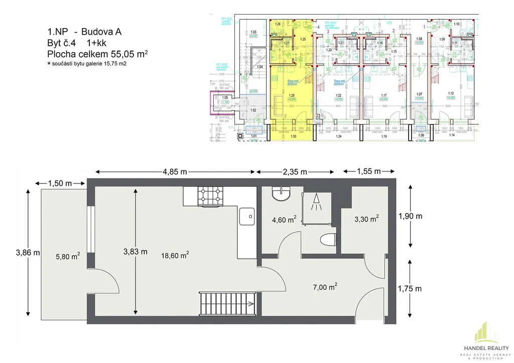 Nabízíme krásný byt 1+kk k prodeji v Břeclavi. S plochou užitnou 55,9 m² poskytuje dostatek prostoru pro pohodlné bydlení pro jednotlivce nebo pár. Byt se nachází v přízemí a disponuje moderním a útulným interiérem, je také vybaven vlastní klimatizací, tím zajistí příjemné a komfortní prostředí po celý rok. Vzhledem k výšce stropu, která činí 4,5 m na bytu naleznete i galerii, která je určená například pro vybudováno ložnice. Dále byt disponuje terasou o velikosti 5,5 m². K bytu přináleží kóje s vlastní přípojkou elektřiny.