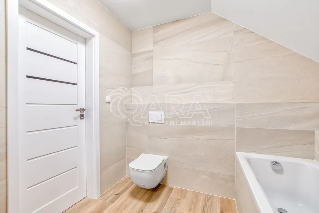 Druhé patro nabízí tři velké, světlé pokoje každý z nich s dostatkem prostoru pro dětský pokoj, pracovnu nebo další ložnici. Součástí patra je rovněž koupelna s vanou a nikami.