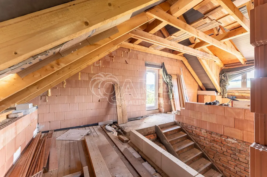 Podkroví (50m) je připraveno včetně rozvodů a odpadů pro výstavbu dalších dvou pokojů s velkým střešním balkonem a nádherným výhledem na pravou Beskydskou krajinu. Díky tepelnému čerpadlu se nemusíte bát vysokých nákladů. Dům je napojený na veřejný vodovod a eletkřinu.