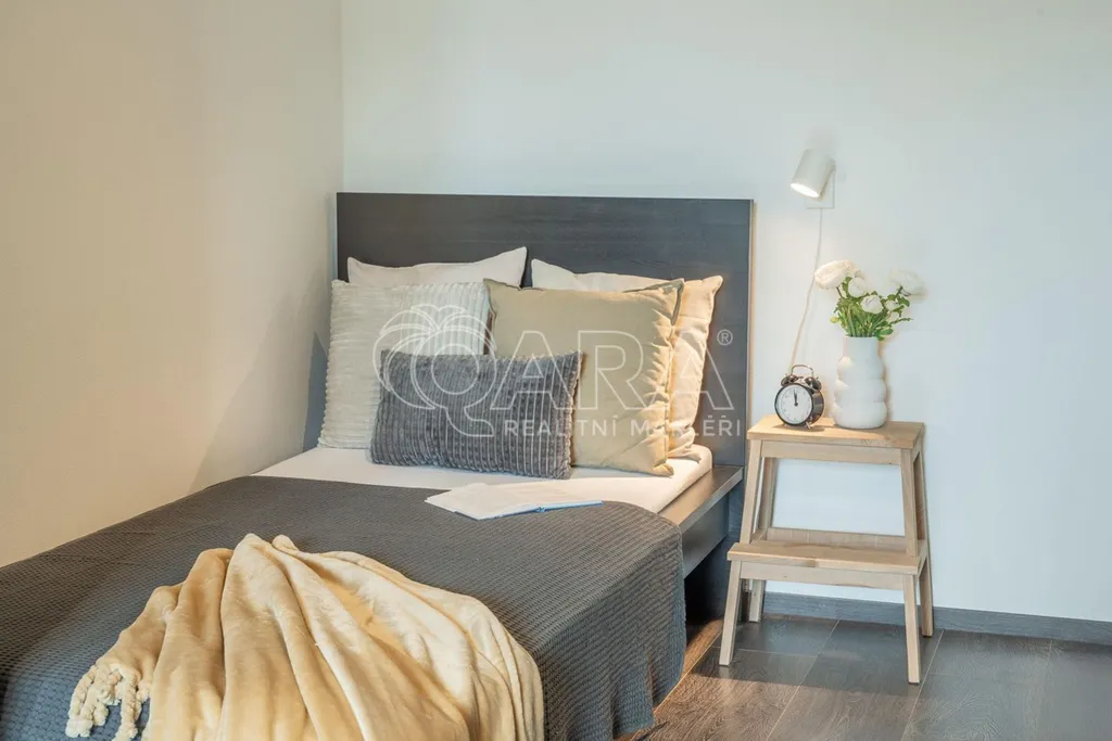 Byt o celkové výměře 136,2 m2 (vnitřní plocha 113,5 m2, balkon 7,2 m2, lodžie 12,5 m2) je výjimečně dobře dispozičně řešen a sestává ze vstupní chodby, obývacího pokoje s kuchyňským koutem, 3 ložnic, koupelny se sprchovým koutem a WC, chodby a koupelny s vanou a s WC. Z obývacího pokoje a ložnice je možný vstup na jižně orientovanou lodžii, ze dvou dalších ložnic pak je vstup na severně orientovaný balkon. V celém bytě je položena plovoucí podlaha, v předsíni a v koupelnách je dlažba. Vytápění zajišťuje centrální plynová kotelna v domě. Měsíční poplatky za byt jsou 3 995,- Kč + zálohy na elektřinu. Dům je vybaven výtahem. V suterénu domu jsou garáže vybavené kamerovým systémem, kde je možnost pronajmout si garážové stání.