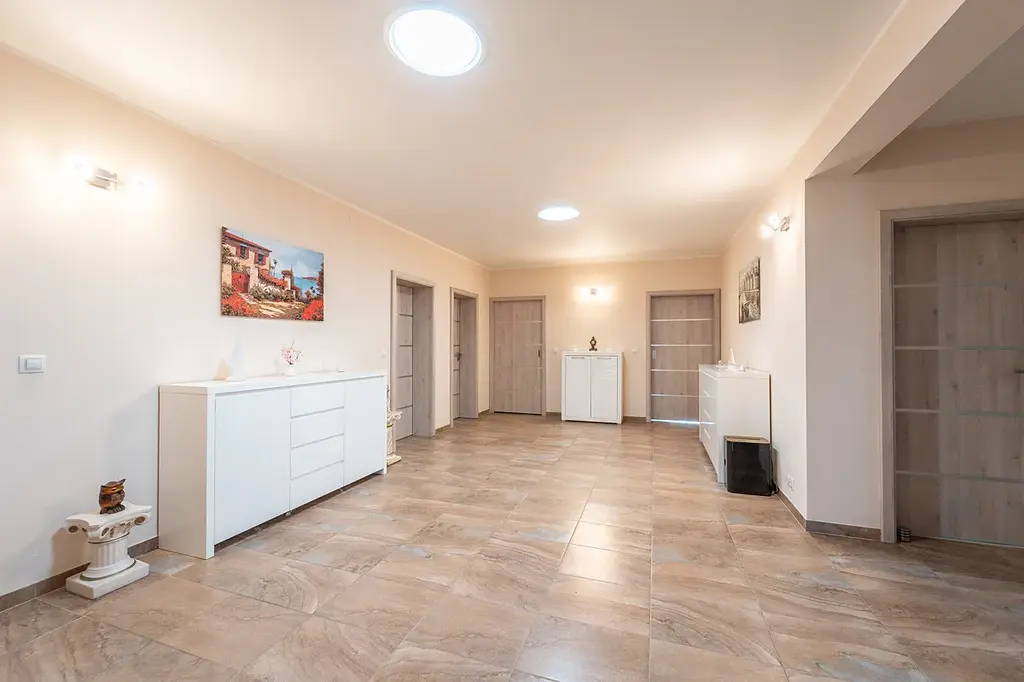 Tepelné čerpadlo v letních dnech nahrazuje klimatizaci a zajistí v domě příjemné teploty. Rozvody jsou vedeny stropem (panel, polystyren) a z tohoto důvodu nelze vrtat do zdí, osvětlení se nachází na zdech a působí jako vhodný designový prvek. Do domu je zaveden plyn, internet, v domě je satelit a videotelefon, který umožňuje otevřít vjezdovou bránu.