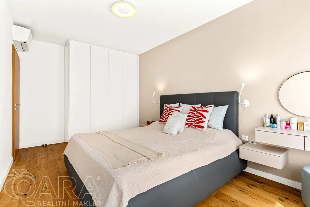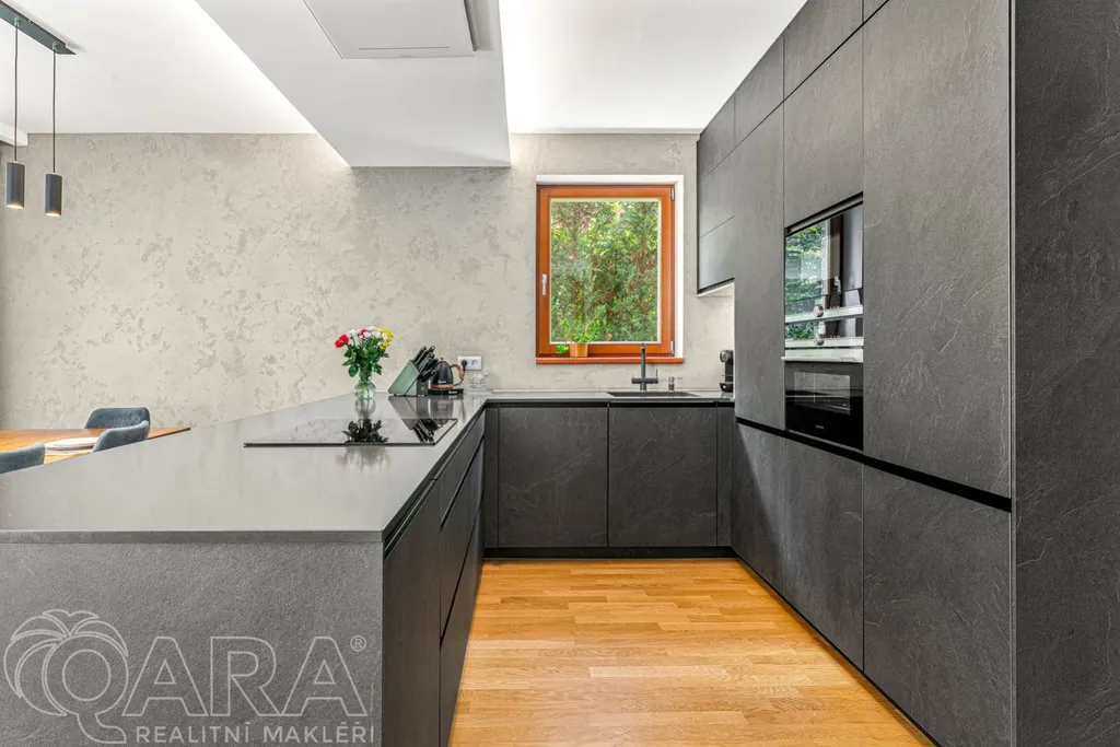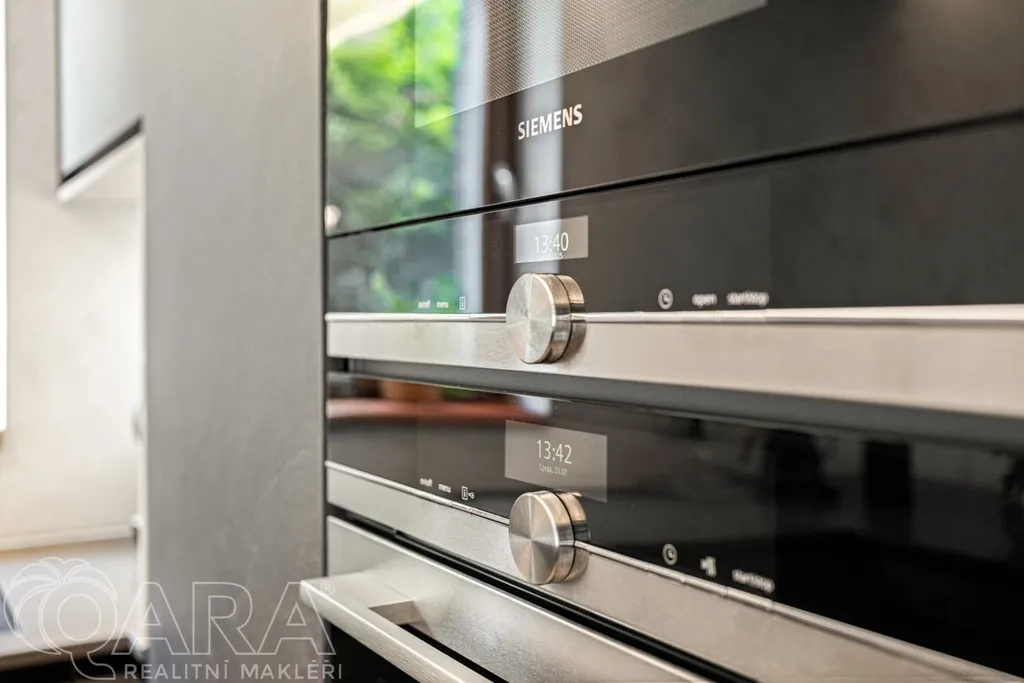 Dominantou celého domu je klimatizovaný obývací pokoj s kuchyňským koutem, o velikosti 40 metrů čtverečních, propojený francouzskými okny se zahradou a funkčním krbem. V kuchyňské části najdete novou luxusní kuchyňskou linku vybavenou prémiovými spotřebiči Siemens, včetně designového odsavače.