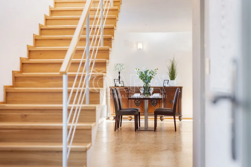 V horním patře lze využít i prostornou dlážděnou terasu. Ta je přístupná z obou dětských pokojů i z jedné z koupelen.